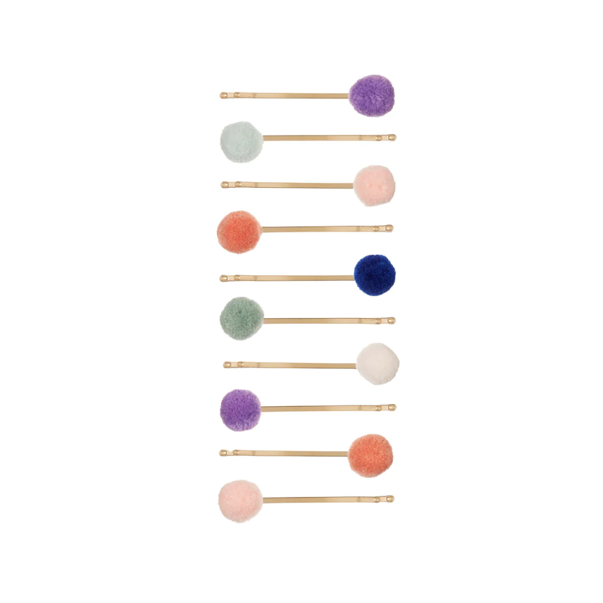 Small but perfectly formed, these super cute mini pom poms are the basis for this bumper pack of pom pom kirby grips. 10 different mini pom poms in a dizzying array of colours securely attached to our super long, super strong gold kirby grips. Decorate plaits, arrange around the top of a pony or bun, wear a few (or lots!) in the side of the hair. The possibilities with these are endless!
