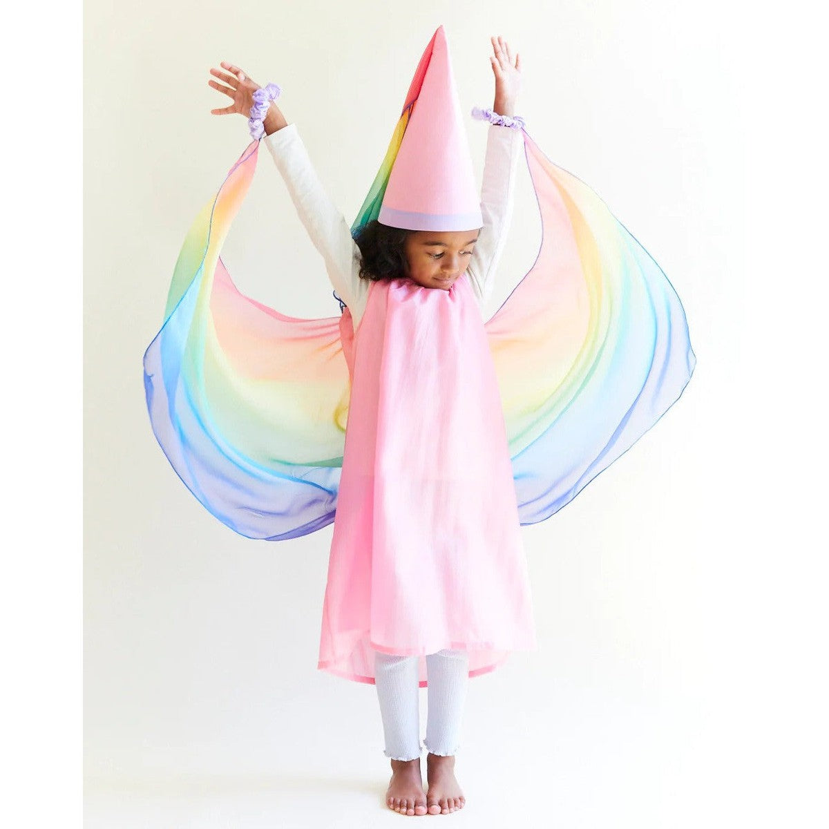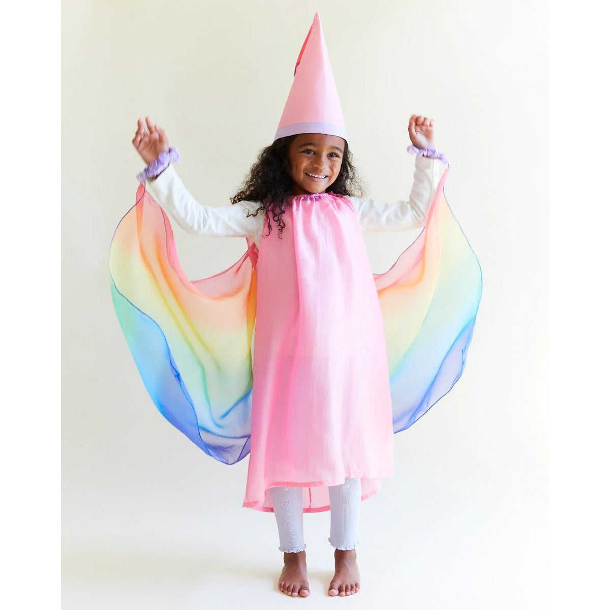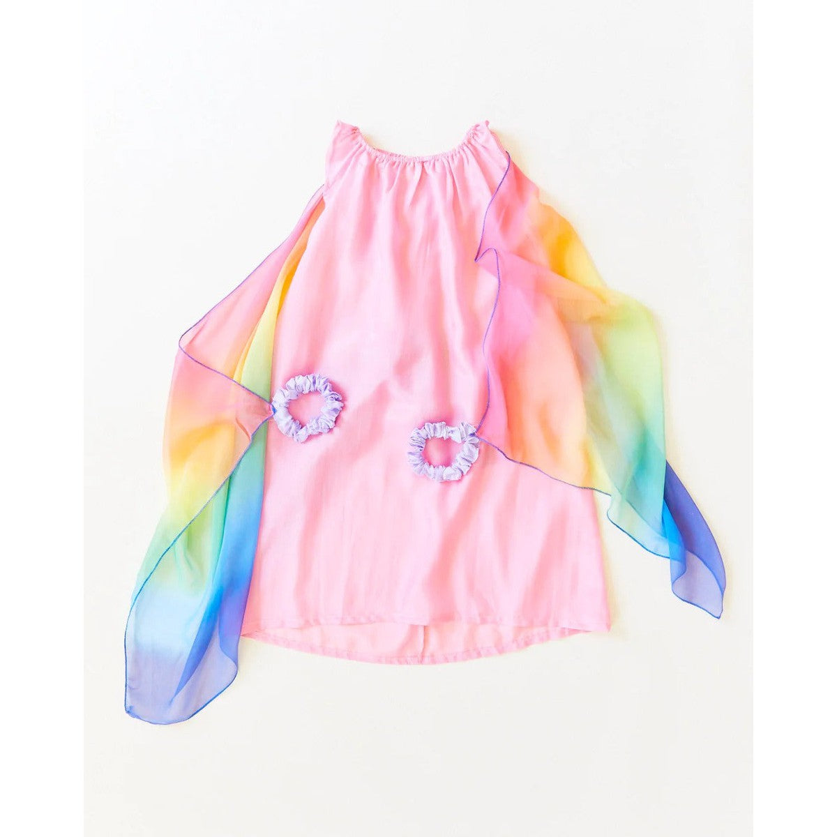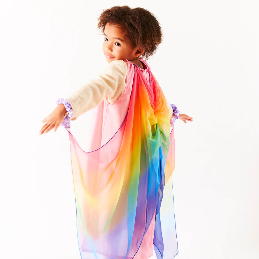 The Fairy Dress is made of heavyweight, 100% pure mulberry silk with airy, georgette rainbow wings attached! A magical costume for a fairy princess, sprite, queen and so much more! Made of soft, sustainable silk and designed to fit comfortably on even the most sensitive little ones, the Fairy Dress is an essential piece for imaginative make-believe play.