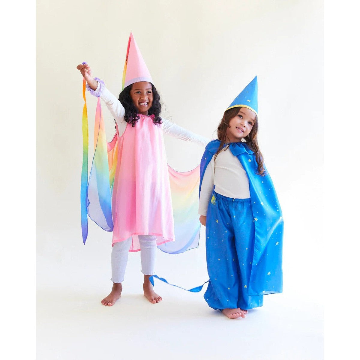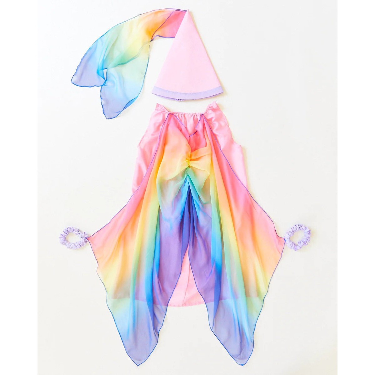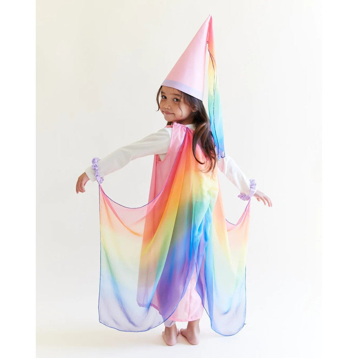 The Fairy Dress is made of heavyweight, 100% pure mulberry silk with airy, georgette rainbow wings attached! A magical costume for a fairy princess, sprite, queen and so much more! Made of soft, sustainable silk and designed to fit comfortably on even the most sensitive little ones, the Fairy Dress is an essential piece for imaginative make-believe play.