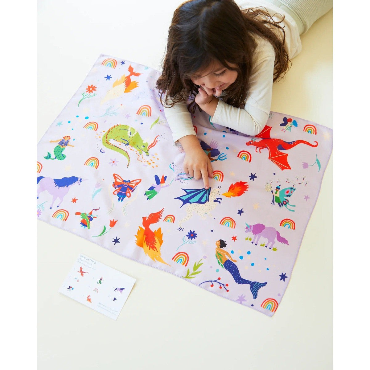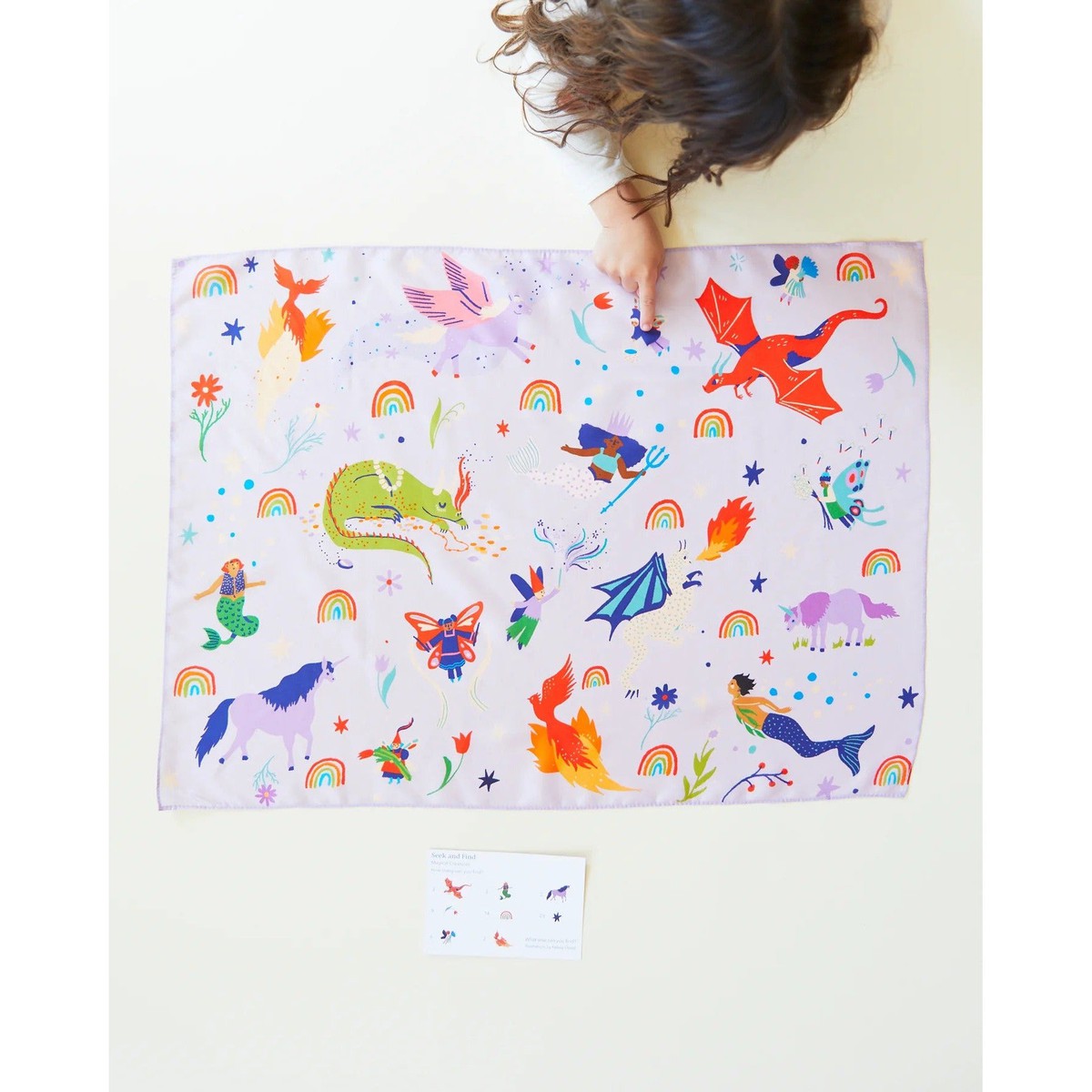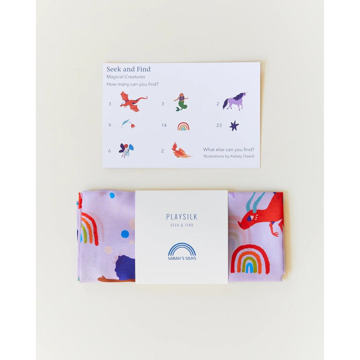 Seek & Find Playsilks are made in collaboration with different artists. The Magical Creatures Seek & Find features artwork by Kelsey Oseid, you can find their work on Instagram @kelzuki