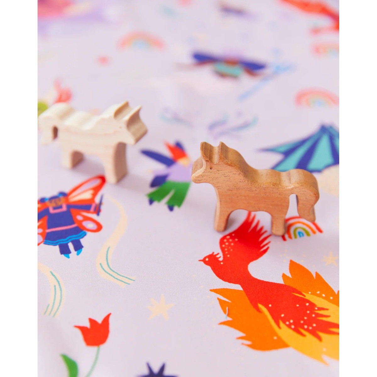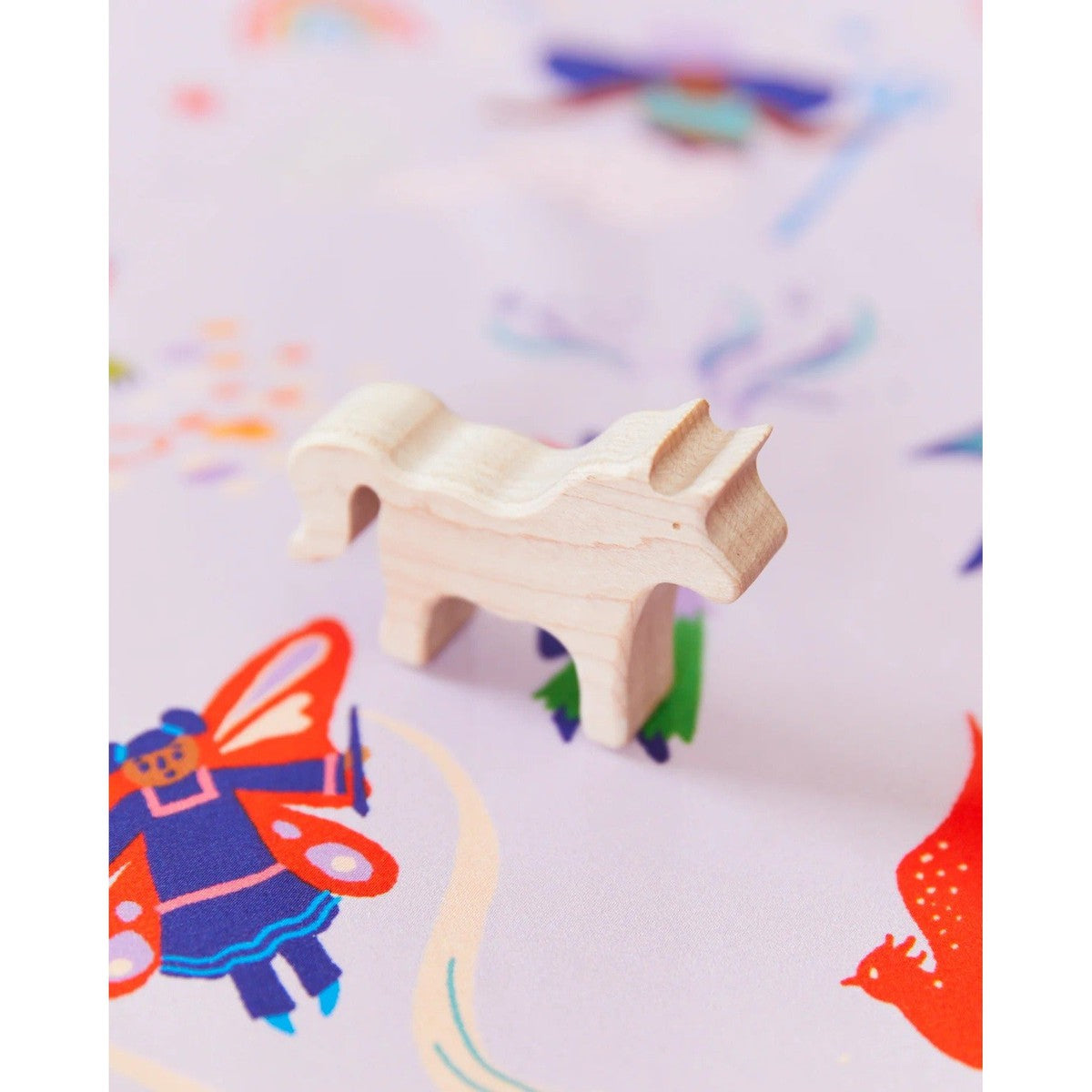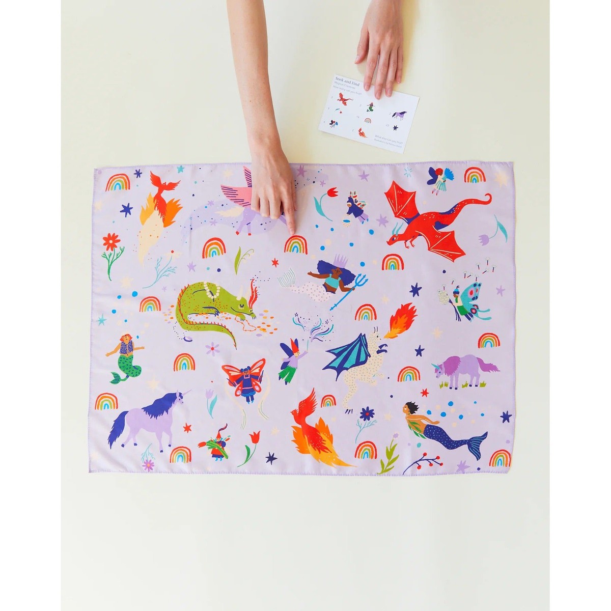 Seek & Find Playsilks are made in collaboration with different artists. The Magical Creatures Seek & Find features artwork by Kelsey Oseid, you can find their work on Instagram @kelzuki