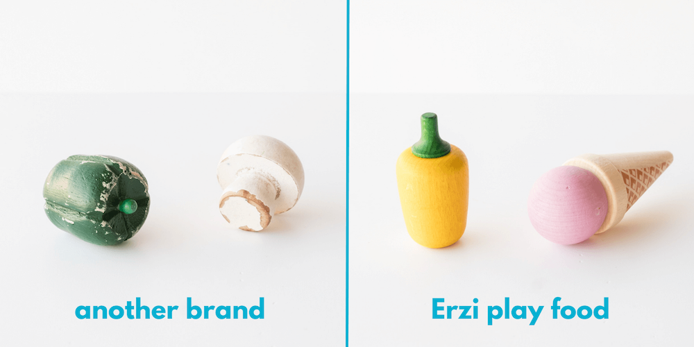 Erzi makes the toughest play food we've come across! Made in Germany with water-based, non-toxic lacquers won't chip off.