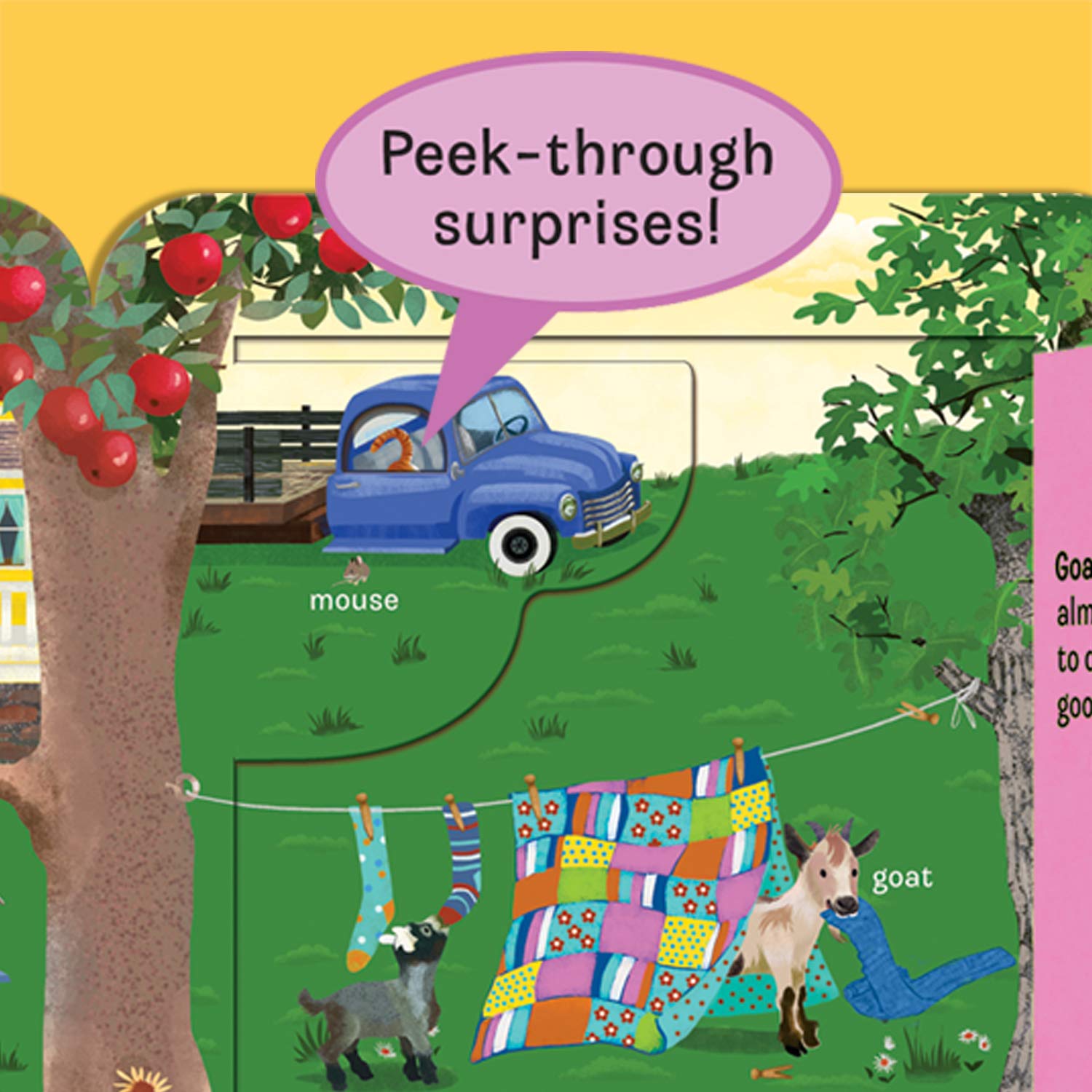 Oink, oink! Moo! Meet all the friendly animals on the farm in this interactive Peek-a-Flap sturdy board book. Little ones will love exploring every farm-themed page filled with fun facts, new vocabulary words, and surprises found under sturdy lift-a-flaps, sturdy enough for even the busiest toddler! Durable pages and chunky flaps are perfect for little exploring hands, which also help strengthen hand-eye coordination and fine motor skills. A lively, educational farm introduction designed to entertain and engage curious little readers. A must for little animal lovers!