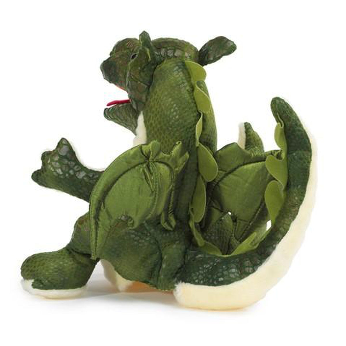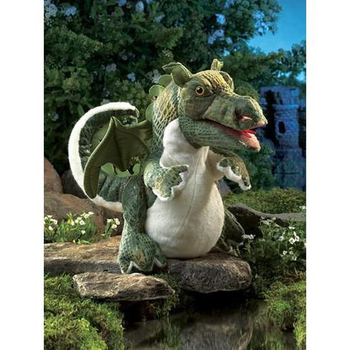 Sitting on his rump, tail curled and reaching for Mom, he may look harmless, but watch out! This BABY DRAGON puppet is a fierce creature in training. Animate his arms and mouth and he'll light fires in your heart. Fashioned in scaly textured fabric with satiny wings, the Baby Dragon puppet measures 8.5-inches tall.