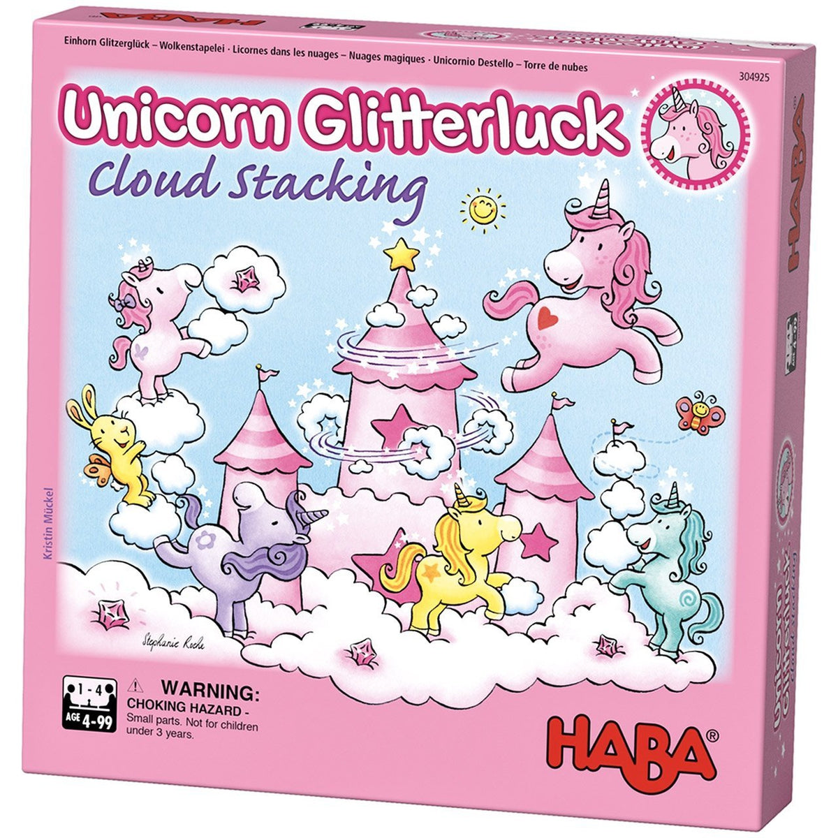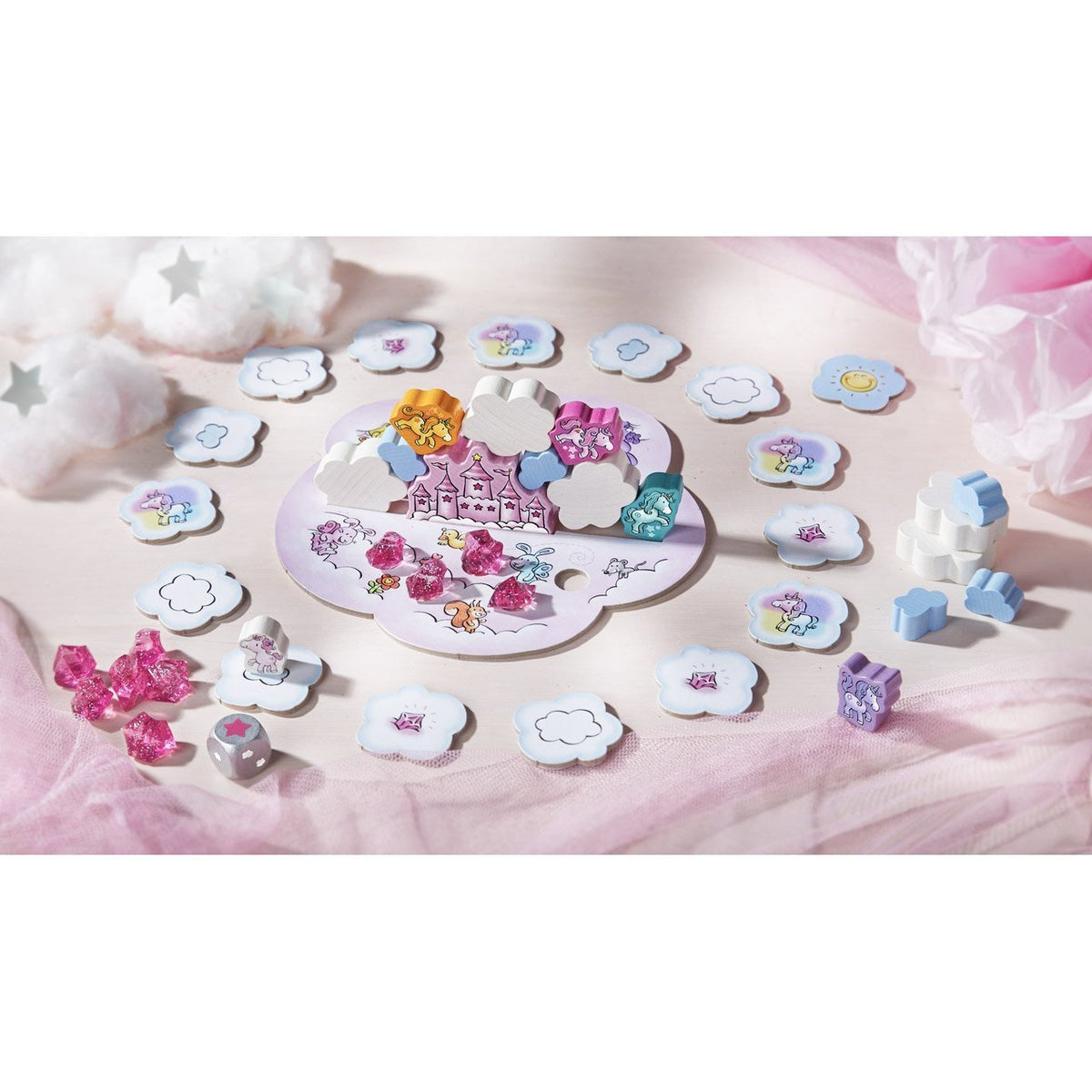 - includes: 4 unicorns, 1 baby unicorn, 1 cloud castle, 5 large white clouds, 5 small blue clouds 1 die, 1 cloud board game, 16 double sided cloud tiles, 10 cloud crystals, 1 set of instructions