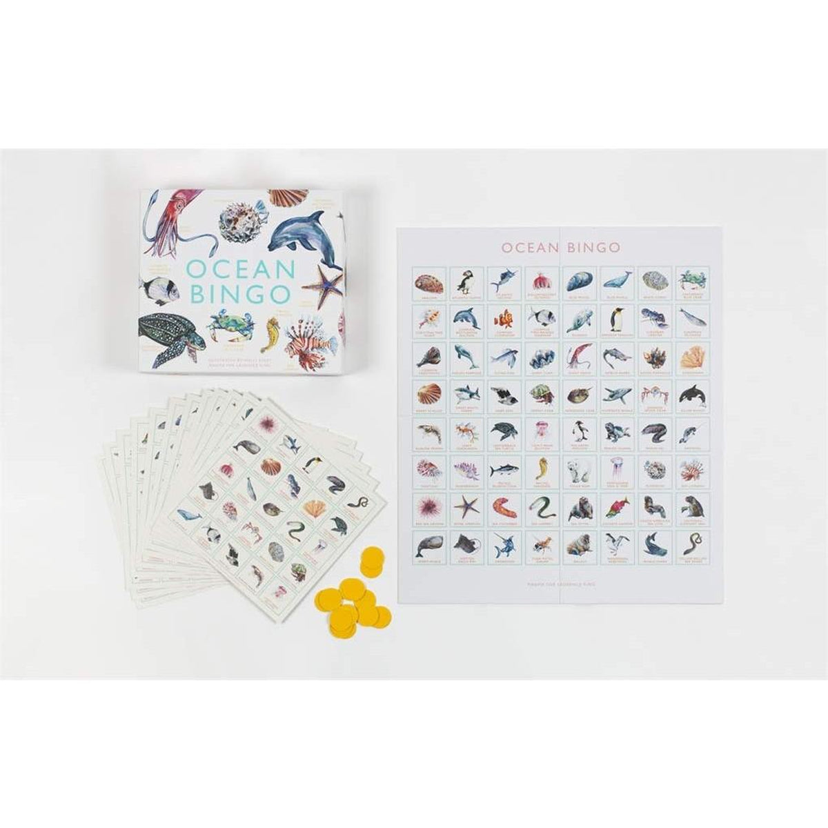 This family-friendly game is packed with ocean creatures for hours of bingo fun. Includes such favourites as the emperor penguin, sea otter, killer whale, and Pacific seahorse as well as lesser known sea inhabitants like the yellow-bellied sea snake and the bioluminescent octopus.