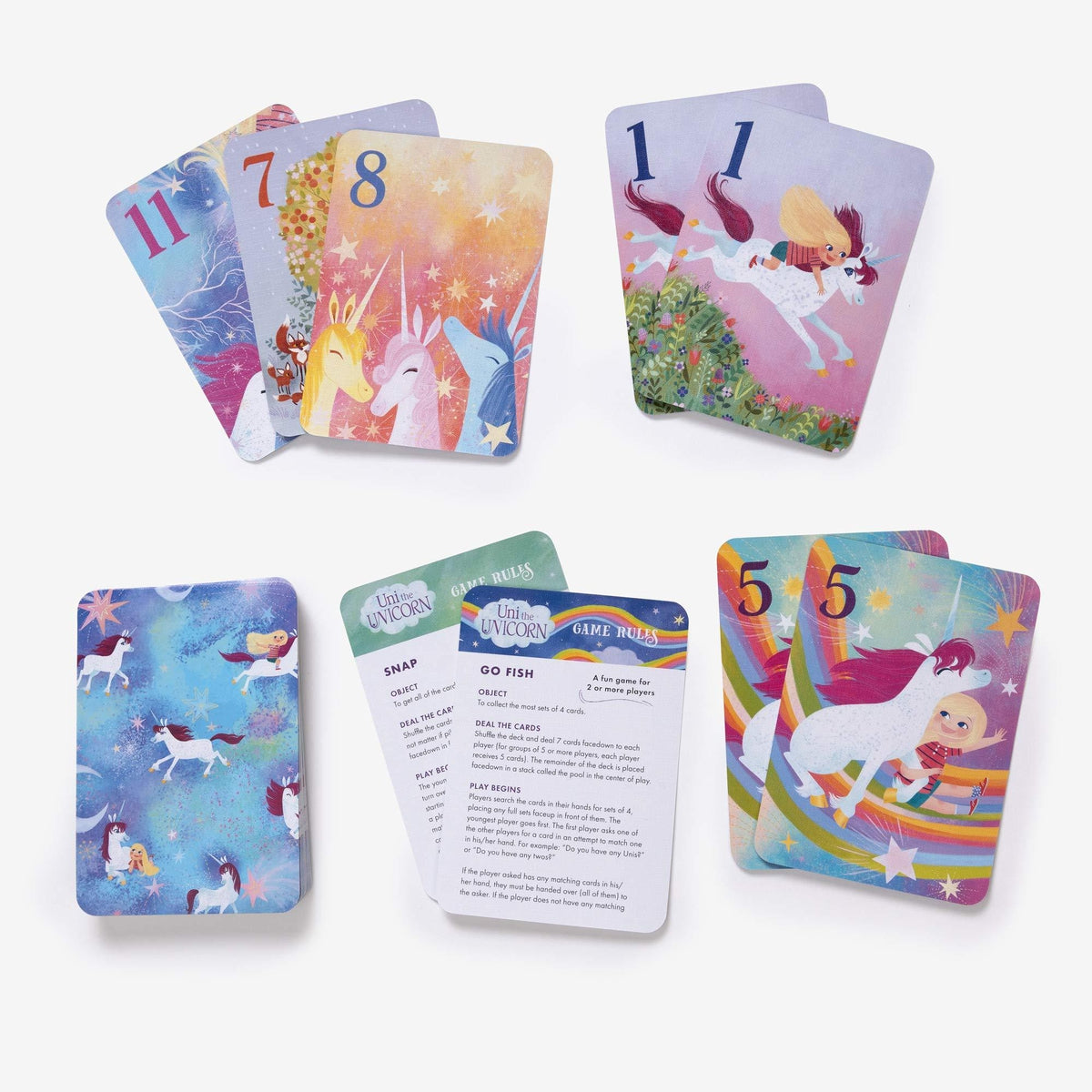 This bright deck of 52 oversized, kid-friendly cards features sparkling illustrations of Uni, dreamy stars and rainbows, charming woodland creatures, colorful flowers, and, best of all, friendship. Two extra cards show rules for three classic card games: Crazy Eights, Concentration (a memory game) and Snap (a kid-friendly card game that’s similar to Slapjack). Family game night has never been this magical!