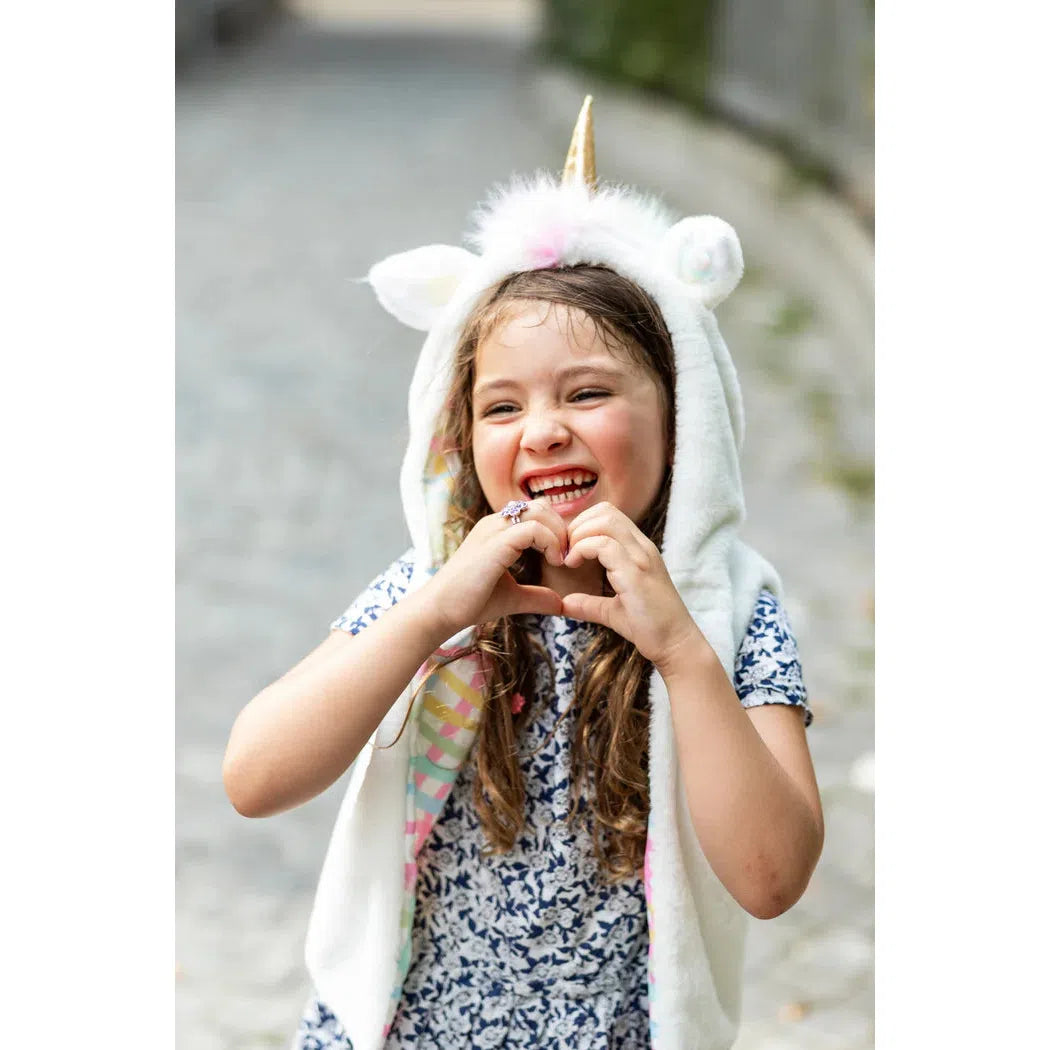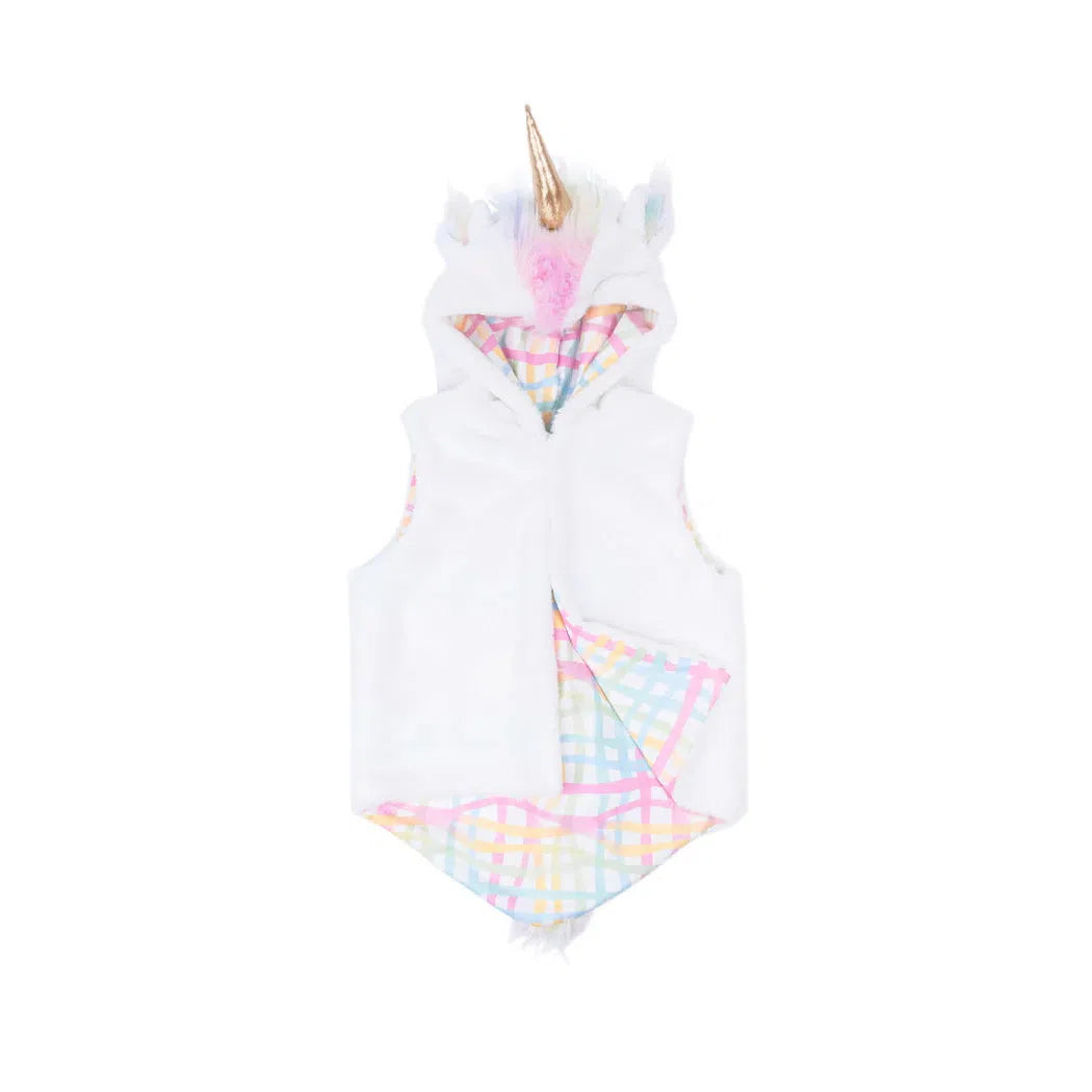 Bring a touch of magic to everyday adventures with The All Day Everyday Unicorn Vest! Made from soft white fur, this enchanting vest features a shimmering gold unicorn horn, accented with pastel fur at its base for an extra dose of whimsy. Lined with a beautiful pastel gingham fabric, the vest offers both comfort and style, making it perfect for imaginative play or adding a magical flair to any outfit.
