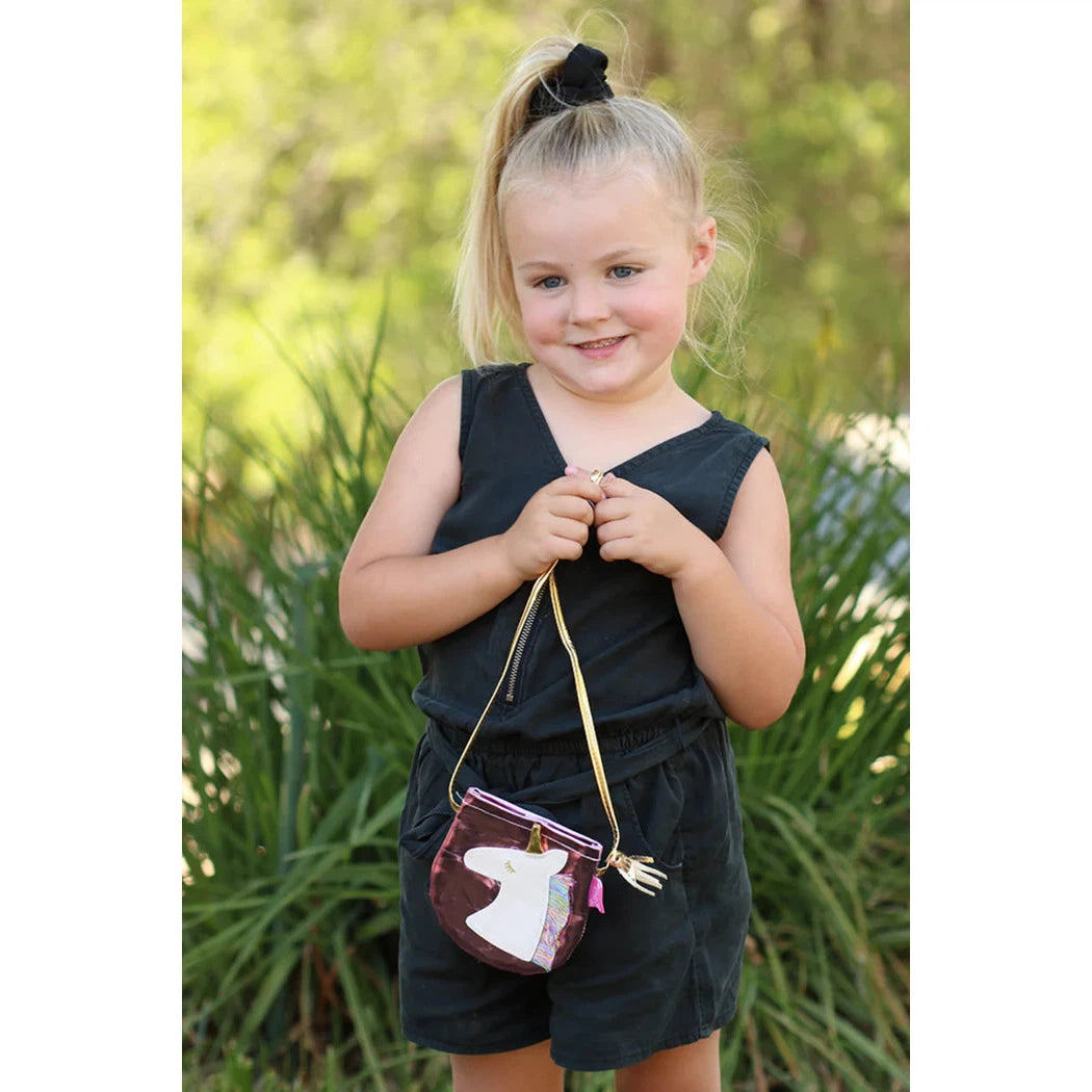 Adorable and vibrant pink purse with a great Unicorn design! It’s 5 x 5” purse size with a 12” perfectly sized golden shoulder strap with a tassel, & Velcro closure for easy fastening. Multicoloured fringe mane and a golden horn add such a special effect to this irresistible little purse! Perfect to carry your lipgloss for a quick run to the grocery store with mom!