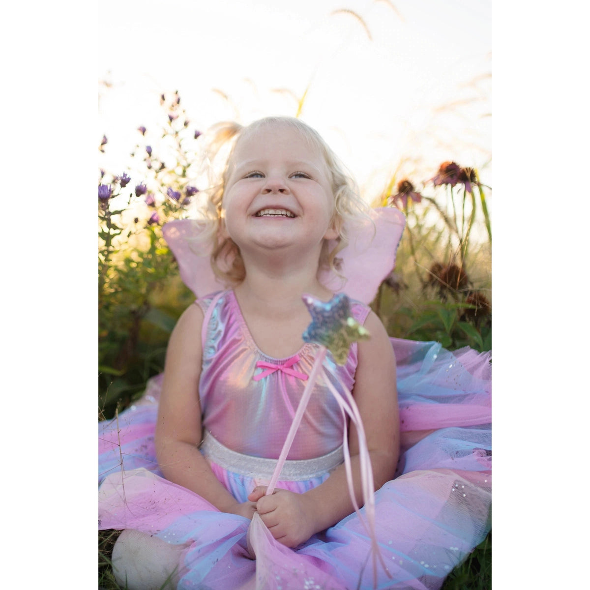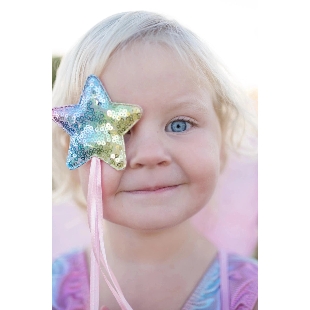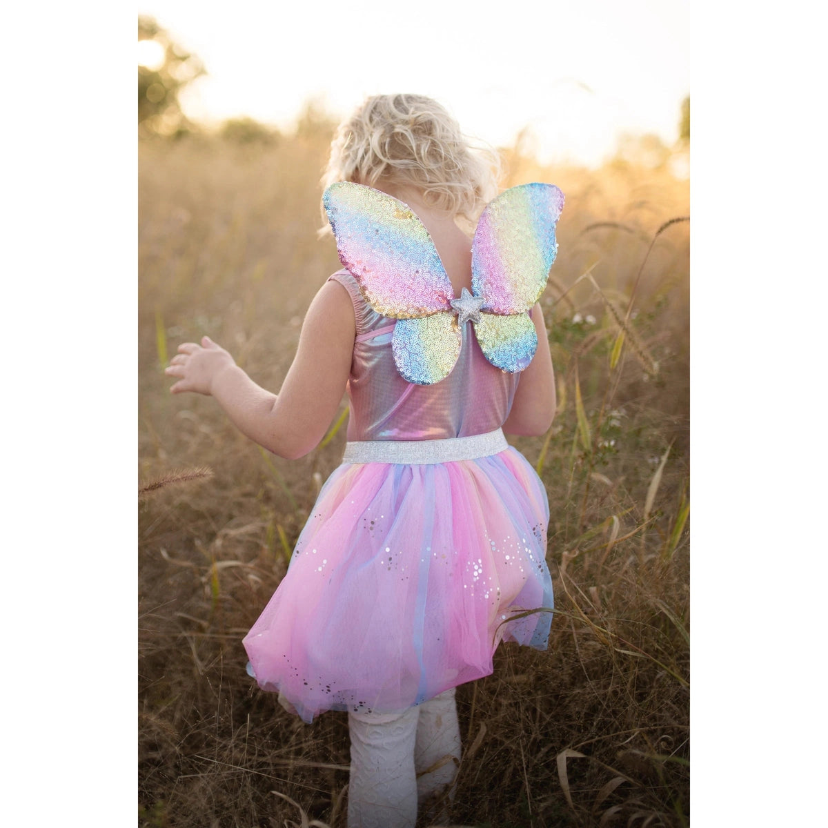 Enjoy all the sparkly fun without any shedding glitter! Our Rainbow Sequins Skirt is made with a wider elasticized waistband which allows for greater comfort and size flexibility. The multi-coloured rainbow skirt is layered and the top mesh layer features holographic heat-sealed sequins for that extra sparkly effect and no glitter shedding! This set includes a sequin-covered star wand with hot sealed flowing ribbons and wings that are covered in rainbow sequins & lined with beautiful pink satin. This a great fun design, the skirt is machine washable, and it’s a truly beautiful ensemble!