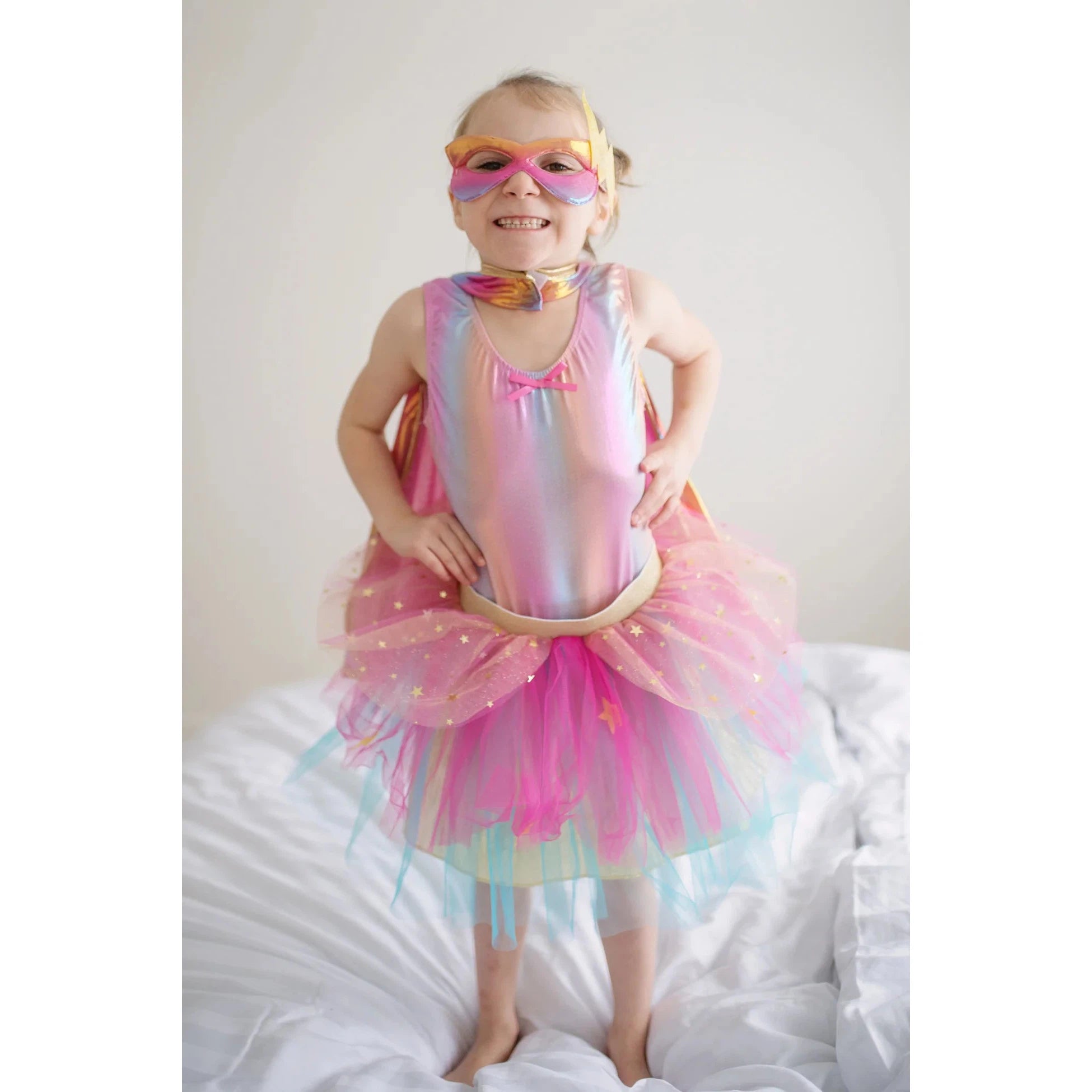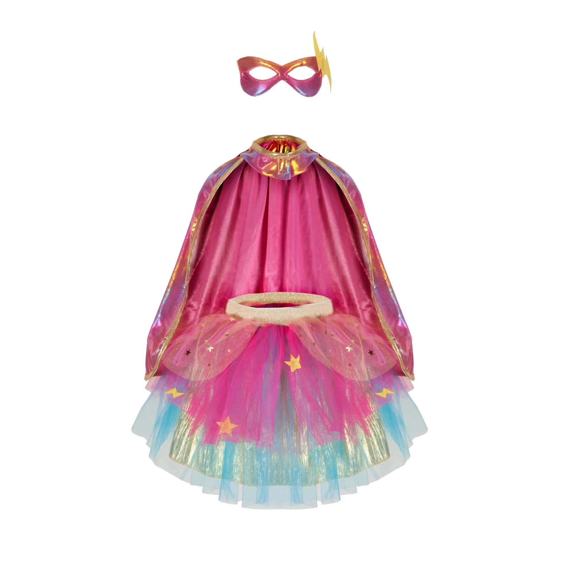 Super-Duper Tutu, Cape, & Mask Sets are AMAZING 3-pc Super Sets! These designs could be superhero or rock star outfits! Waistbands are fabric wrapped for a nice finish & comfort (no scratching here).  The emblems on the back of the capes are embroidered around the edges for a nice finish. The pink holographic cape is lined for a complete elegant finish.  There are a star and lightning bolt accents on the skirts with a small pc of round felt on the back to hold them securely to the tulle. The skirts have a peplum and two layers of tulle with a fantastic crinkle metallic bottom lining layer. The masks are double-sided and have a lightning bolt feature to match the set perfectly.