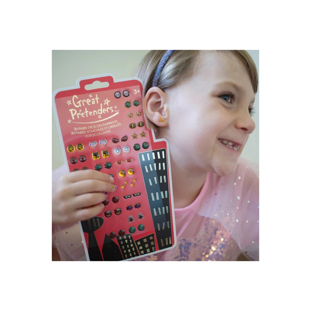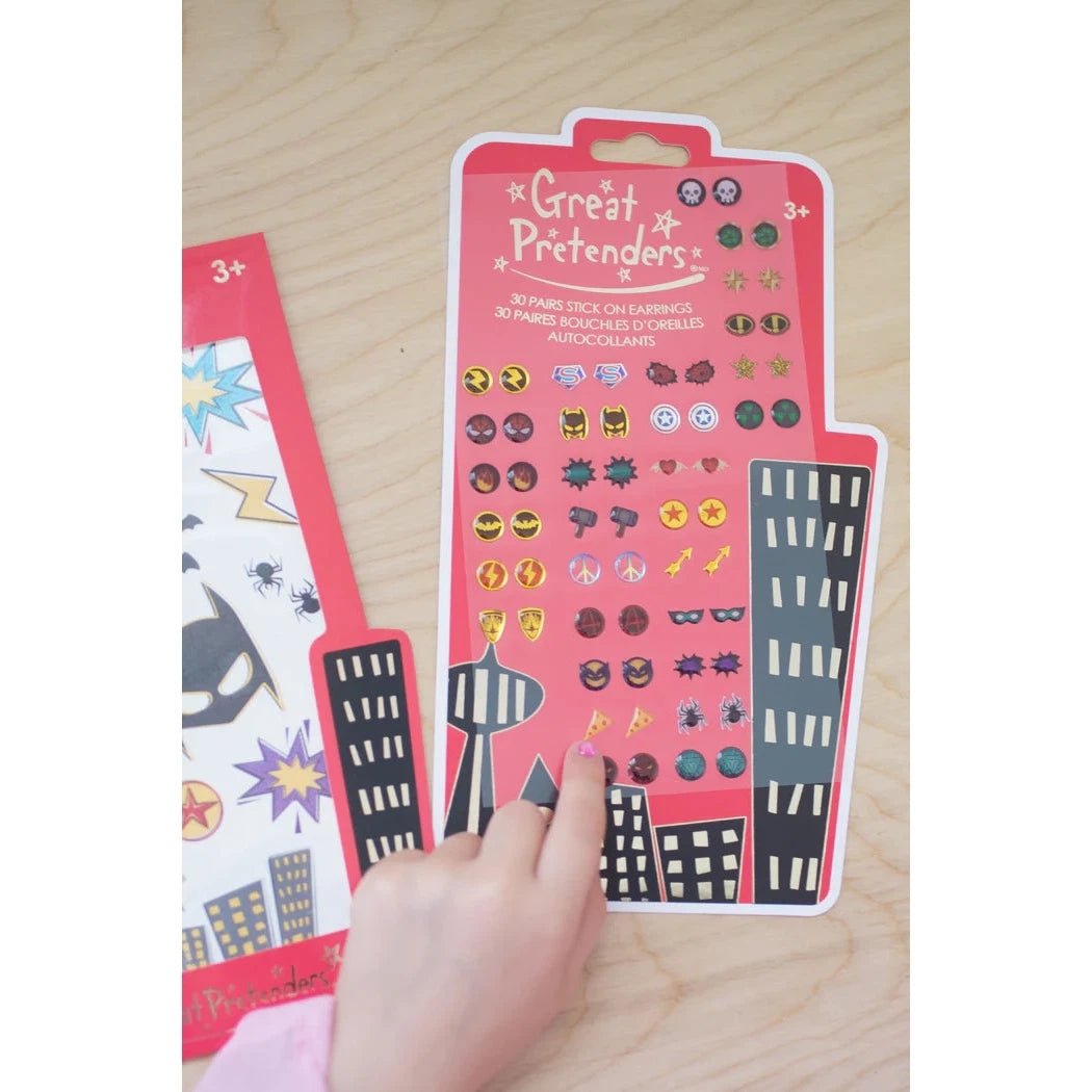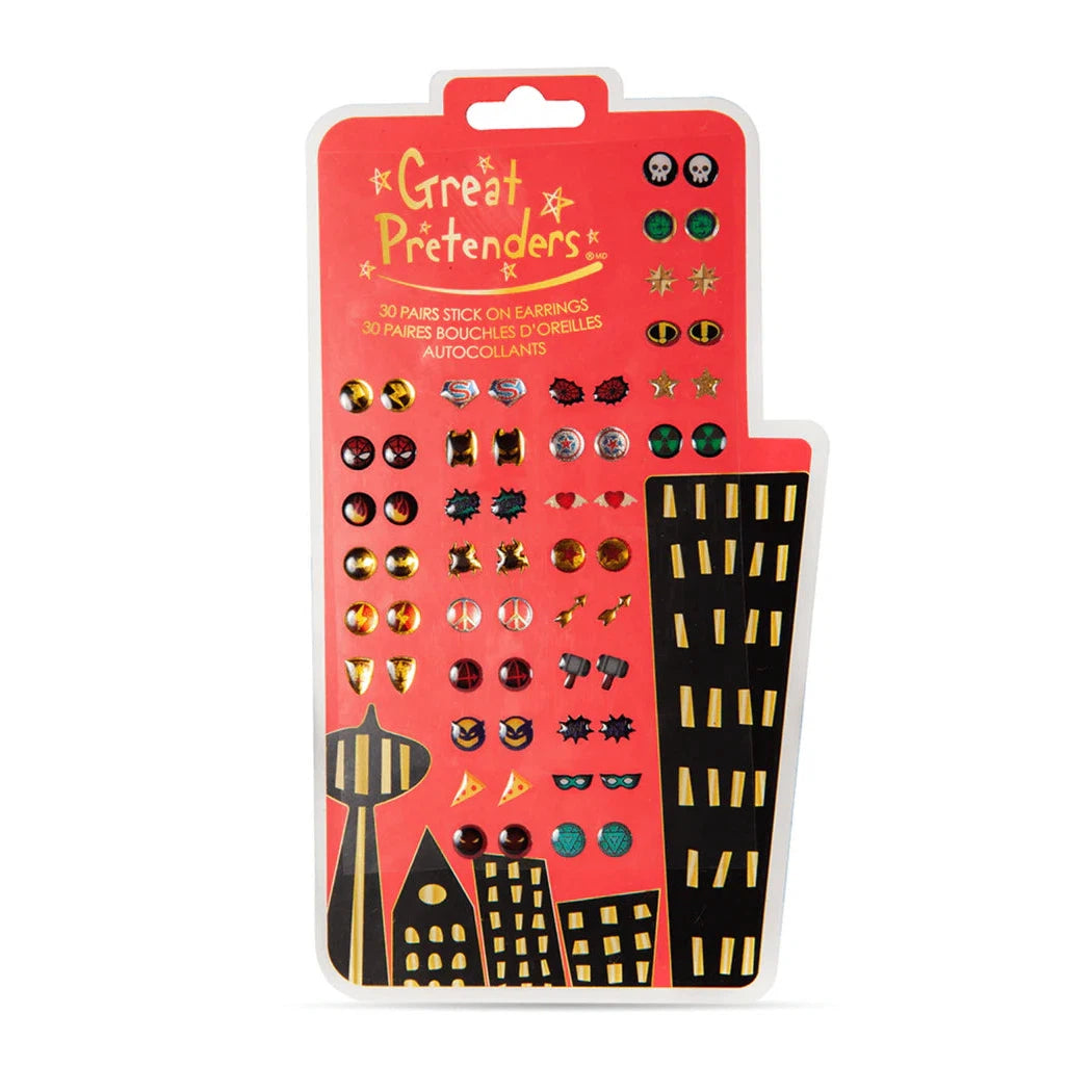 30 pairs of stick on earrings! A different pair everyday of the month. Achieve the pierced ear look without having your ears pierced with these amazing superhero and comic book earrings. These stick on earrings will stay on for hours of super play with 30 pairs to choose from!