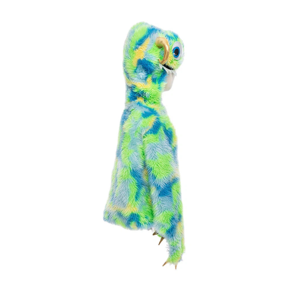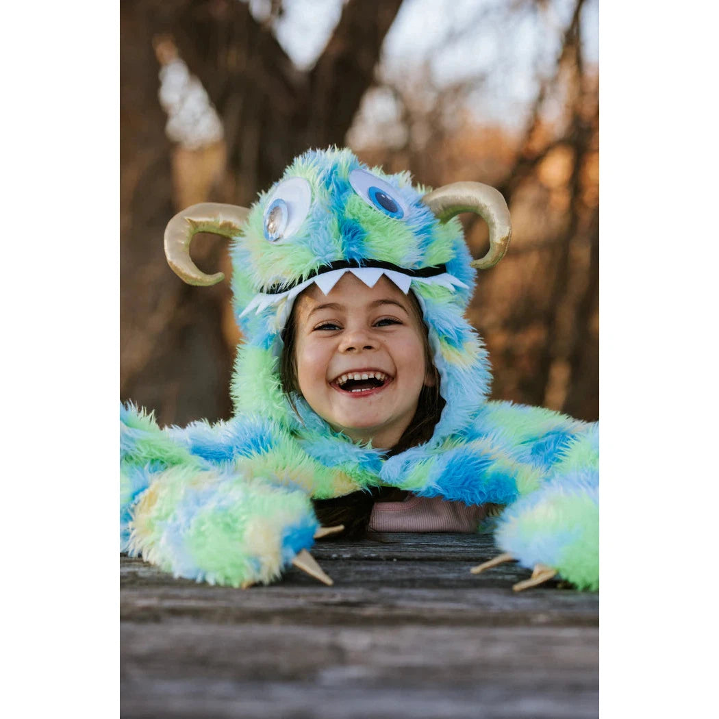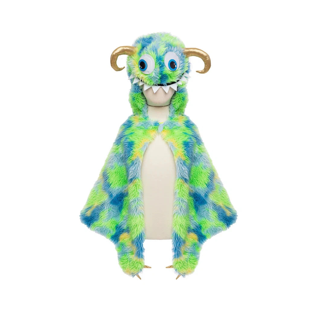 Immerse yourself in the world of mystical creatures with the captivating blend of vibrant blue and green hues, elegantly swirled in a mesmerizing tie-dye pattern. Each cape is hand-dyed, ensuring a unique and one-of-a-kind piece that stands out in any crowd. The vibrant colors exude energy and vitality, reflecting the vibrant spirit of those who dare to embrace their inner monster. This cape is made with long-pile fur & the addition of googly eyes and stuffed gold horns on the hood adds an extra element of fun and excitement.