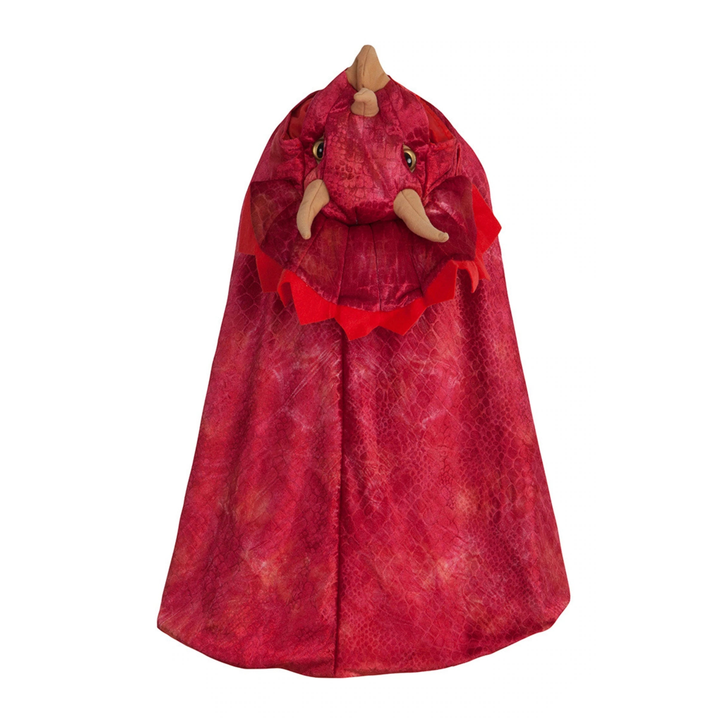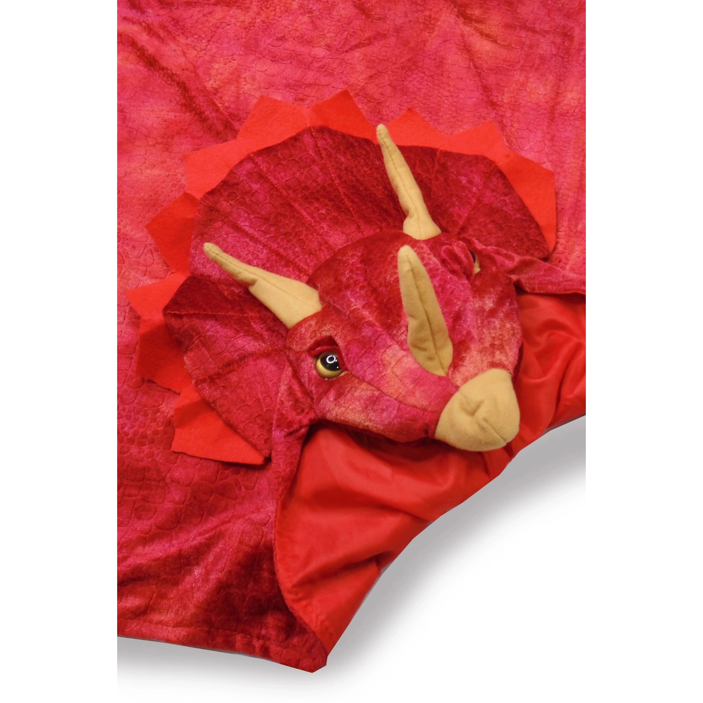 Dinosaurs that are Jurassic! This dino cape from our Dino Collection, features textured velour, realistic eyes, and 3D stuffed detailing. Horns and felt detailing around the head make this Triceratops dino something to roar about! A lined hood and Velcro closure makes this cape durable and always machine washable.