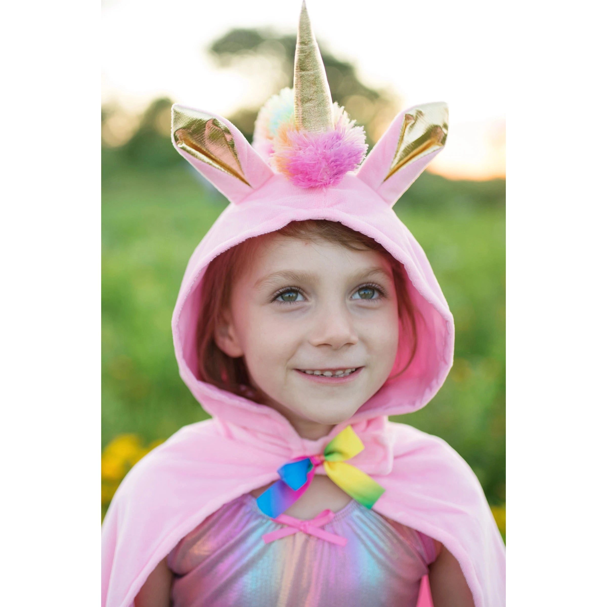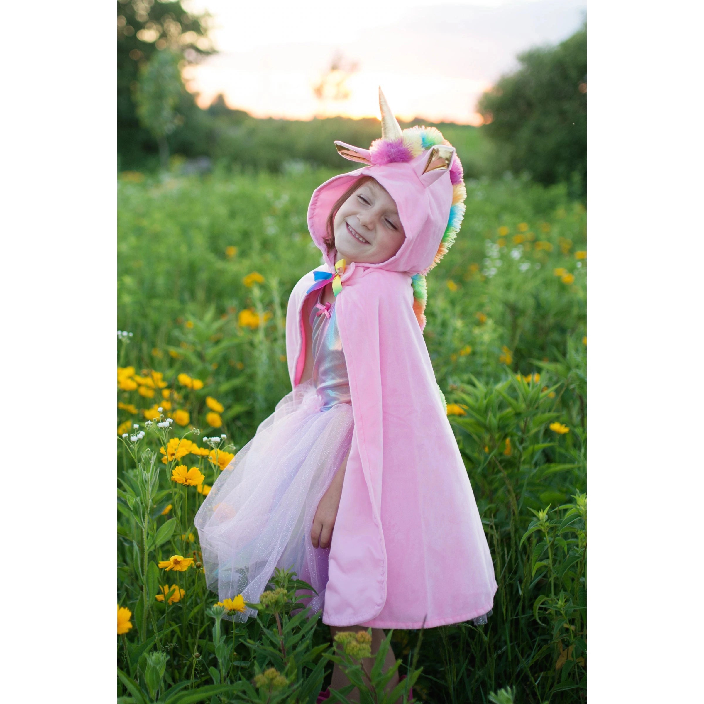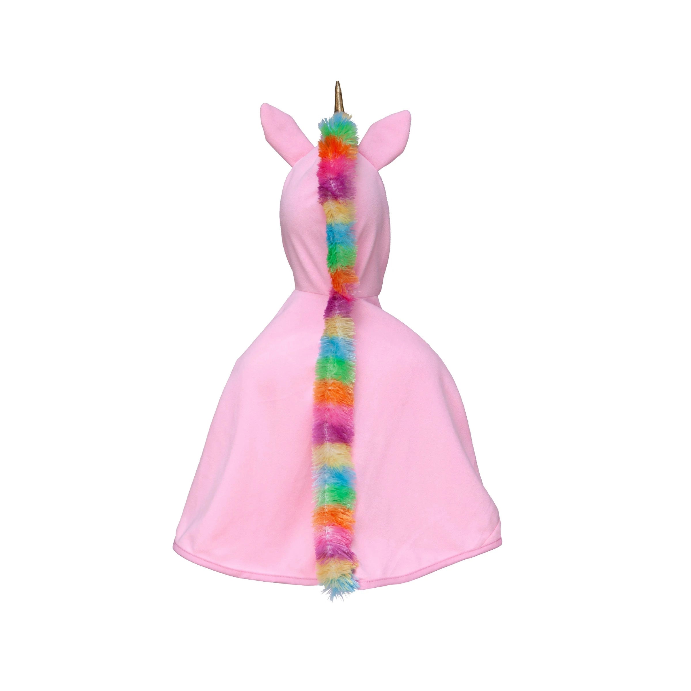 Adorable soft Unicorn cape featuring a bright multi-coloured mane, golden ears, and a golden horn. A Velcro closure at the neck ensures for easy on and off dress-up. The pink fluffy fabric feels like soft velvet, and this cape is machine washable in case your mini takes their unicorn magic outside.