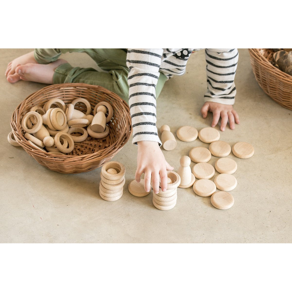 Peek-a-boo, we see you! Stack the rings around the 'nins' to hide partially or completely, top it off with a coin! Or, do something completely different - it's all up to you! This set of wooden nins, rings, and coins puts more tools in your tool box (or toys in your treasure chest as we like to say) to spark creativity and foster autonomous play.
