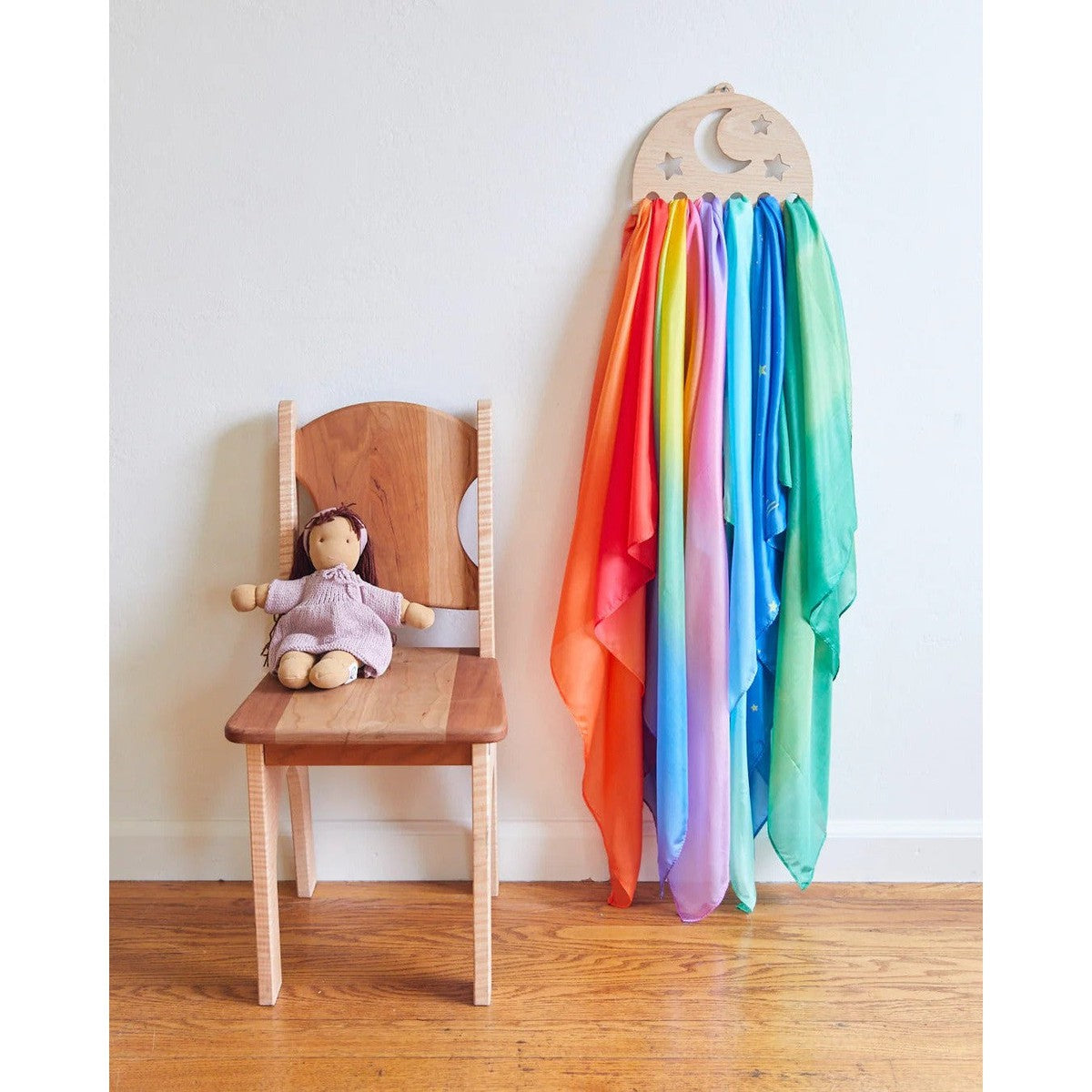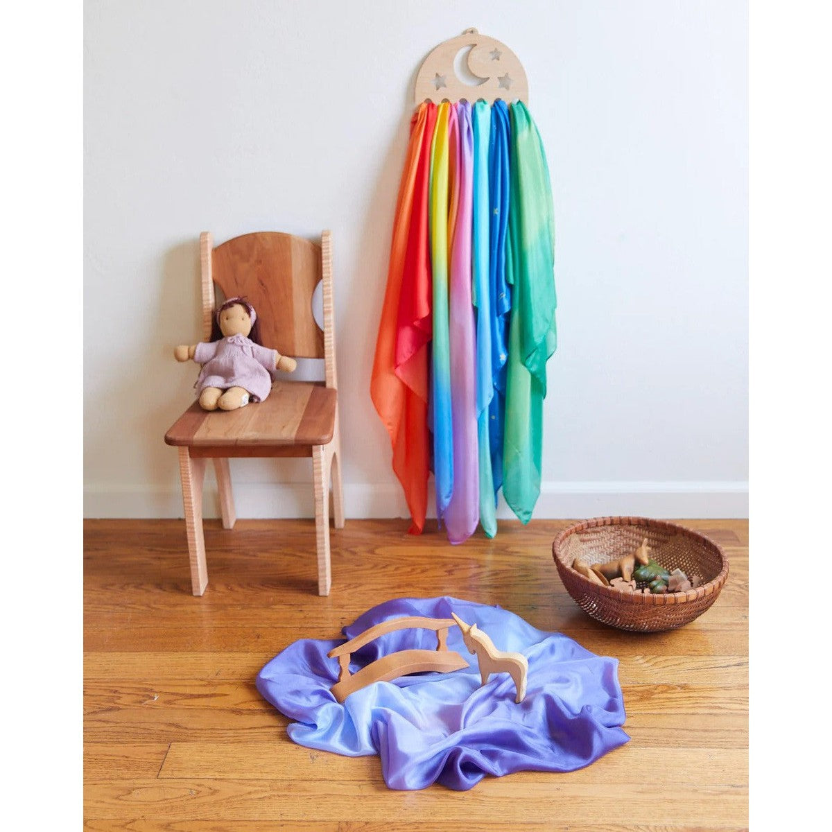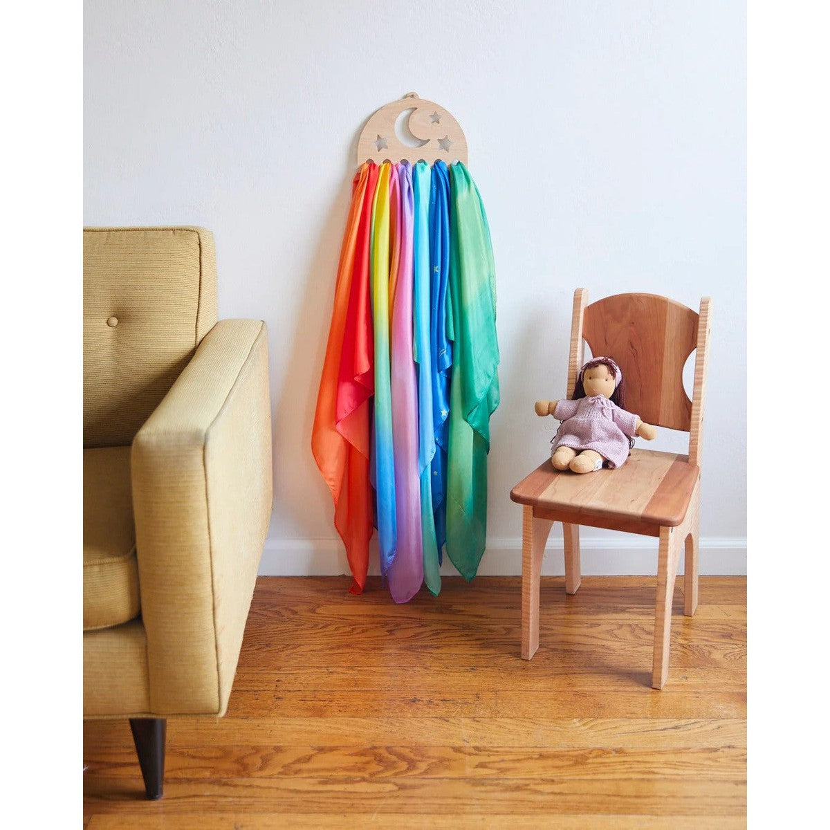 A beautiful display option for homes and classrooms. Simply hang on a wall and slip your Playsilks through! Easy and fun for children learning to care for their toys and encourages young ones to keep playrooms tidy.
