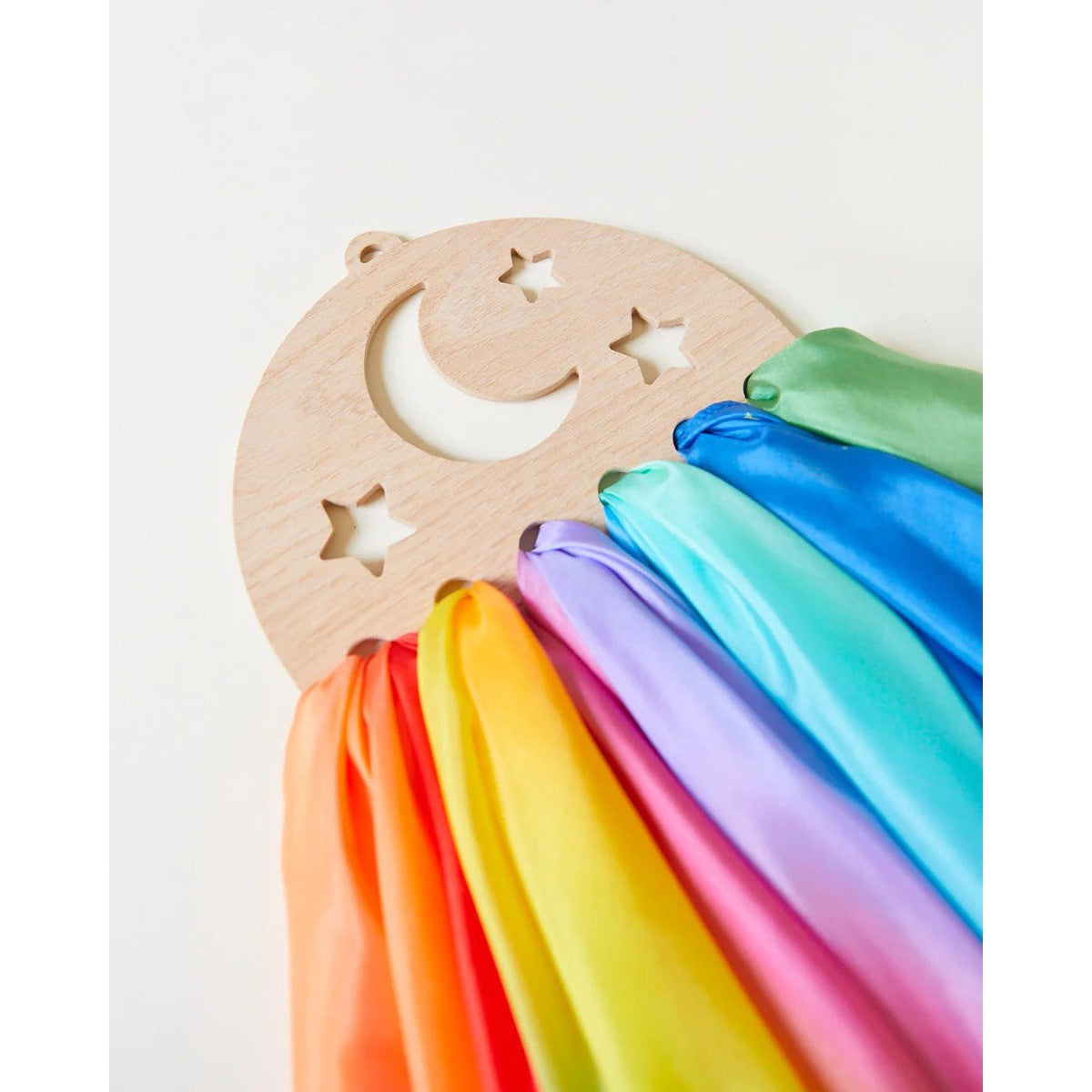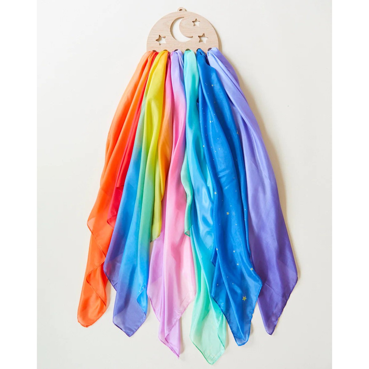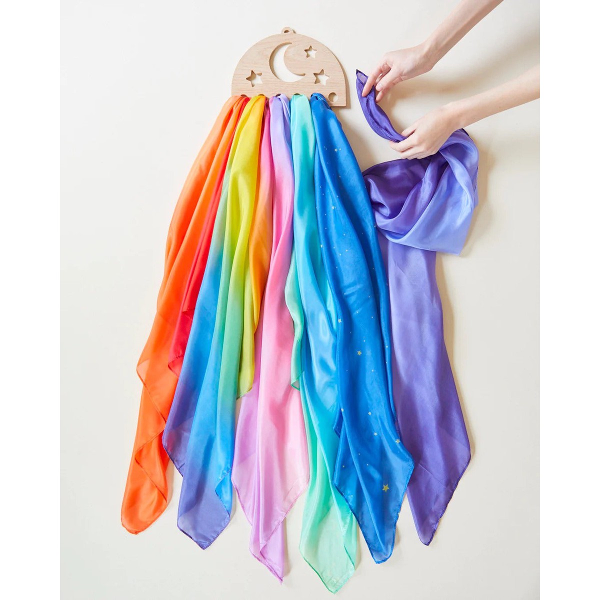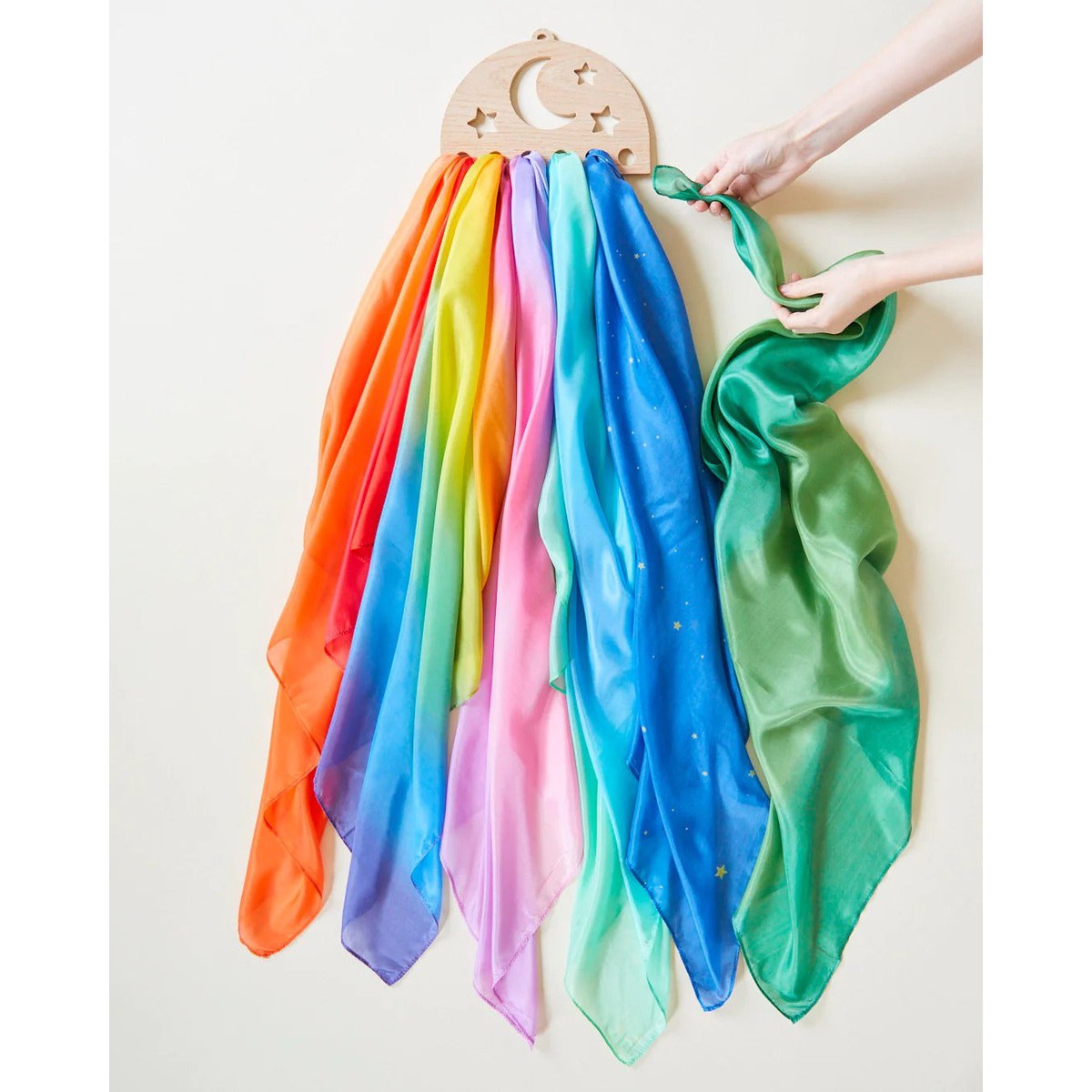 A beautiful display option for homes and classrooms. Simply hang on a wall and slip your Playsilks through! Easy and fun for children learning to care for their toys and encourages young ones to keep playrooms tidy.