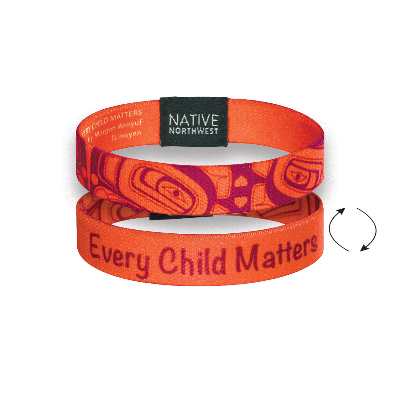 The Every Child Matters Inspirational Wristbands help more people participate in Orange Shirt Day on September 30th and show their commitment to Reconciliation year-round. Made from stretchable polyester, these gorgeous wristbands feature a unique design by Ts'msyen (Tsimshian) artist Morgan Asoyuf with the words "Every Child Matters" inscribed in the centre. Proceeds from Every Child Matters Orange Shirt Day products will be directed to the Native Northwest Reconciliation Fund to support people and families who continue to be impacted by Residential Schools and intergenerational trauma.