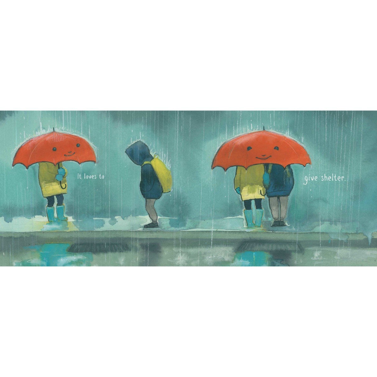 By the door there is an umbrella. It is big. It is so big that when it starts to rain there is room for everyone underneath. It doesn’t matter if you are tall. Or plaid. Or hairy. It doesn’t matter how many legs you have.