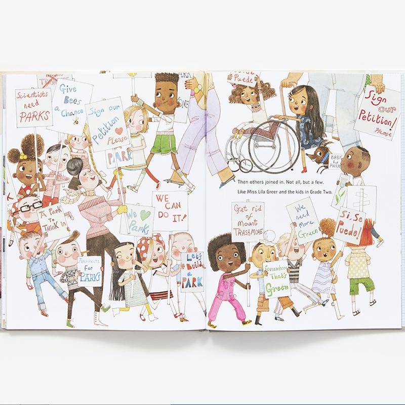 Every morning, Abuelo walks Sofia to school . . . until one day, when Abuelo hurts his ankle at a local landfill and he can no longer do so. Sofia (aka Sofi) misses her Abuelo and wonders what she can do about the dangerous Mount Trashmore. Then she gets an idea—the town can turn the slimy mess into a park! She brainstorms and plans and finally works up the courage to go to City Hall—only to be told by a clerk that she can’t build a park because she’s just a kid! Sofia is down but not out, and she sets out to prove what one kid can do.
