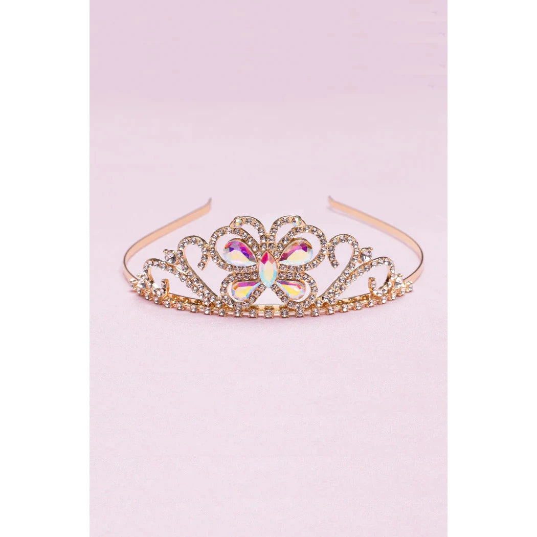 Our Boutique Butterfly Jewel Tiara features a delicate band adorned with intricate rhinestones and a beautiful jeweled flower gracing the front, reflecting the brilliance of light as it dances across the room.
