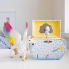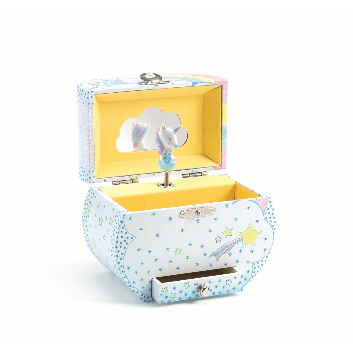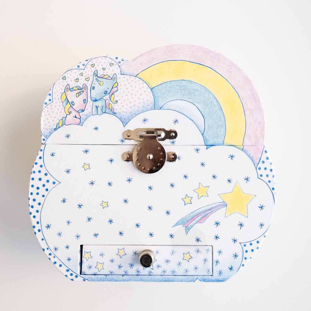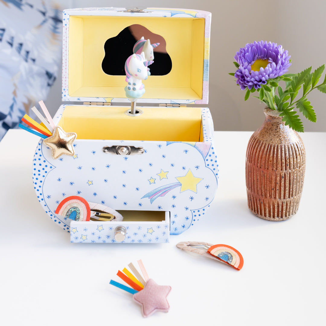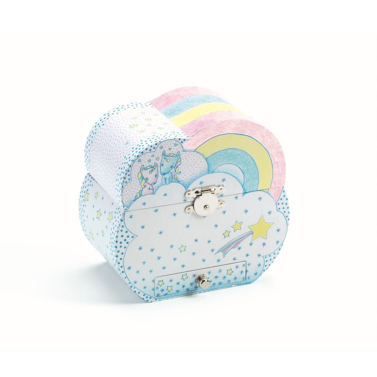 Keep all your precious jewels, gems, and mementos safe in this musical treasure box from Djeco. This paper covered box has a fluffy cloud shape with rainbow, stars, and a unicorn figurine. Turn the crank, open the box, and watch as the small unicorn figure comes to life to the music. This box also has a cloud-shaped mirror, felt lining, and a metal clasp closure.