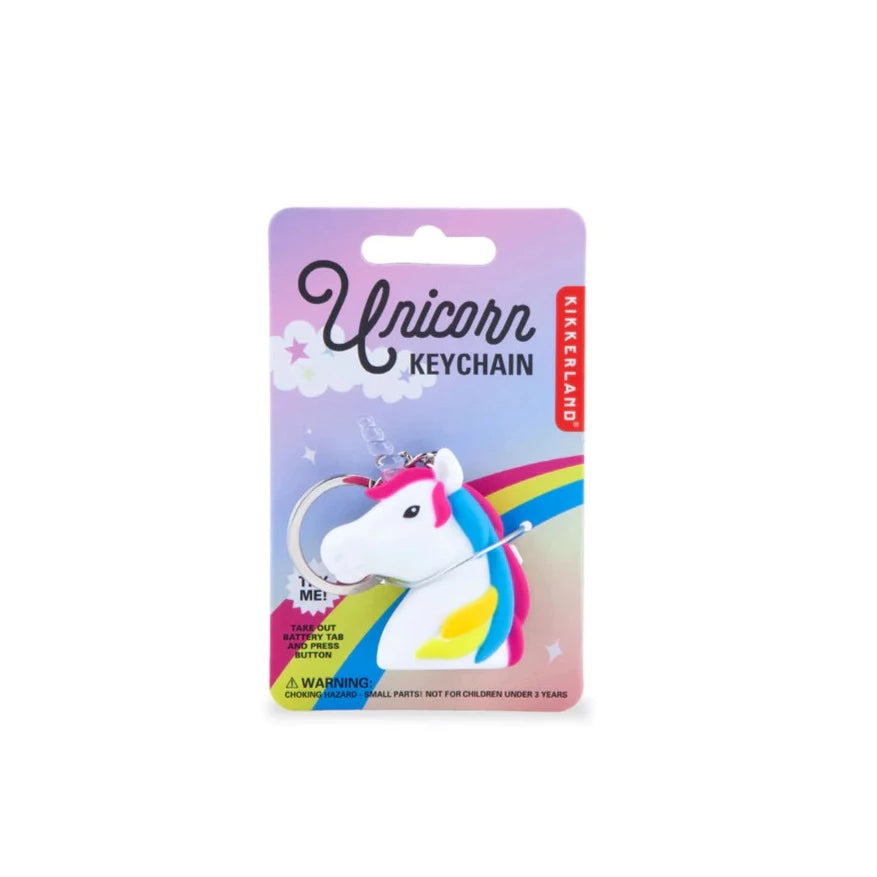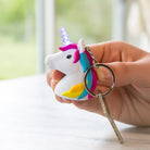Keep your keys from magically disappearing with the care of this mythical unicorn keychain. With the push of a button the unicorn's horn lights up with rainbow LED light and emits a magical sound.