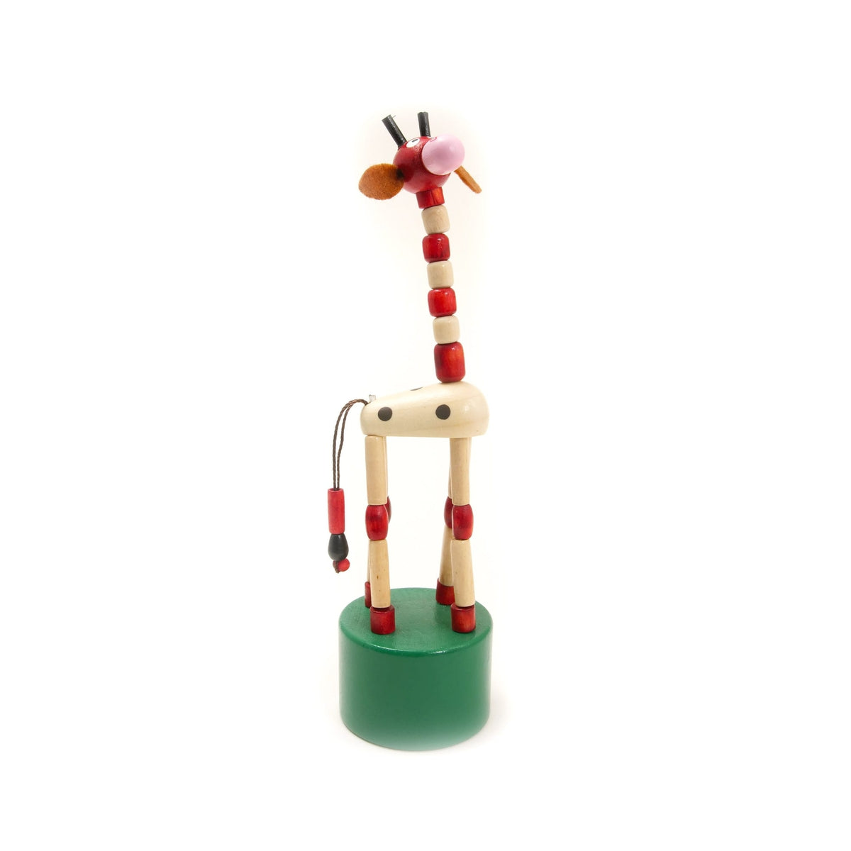 A jiggling, jumping, and dancing classic toy. This wobbly wooden giraffe wiggles and wobbles when you push up on the button on the underside of the toy. A fun fidget toy, this little giraffe is a happy little animal pal.