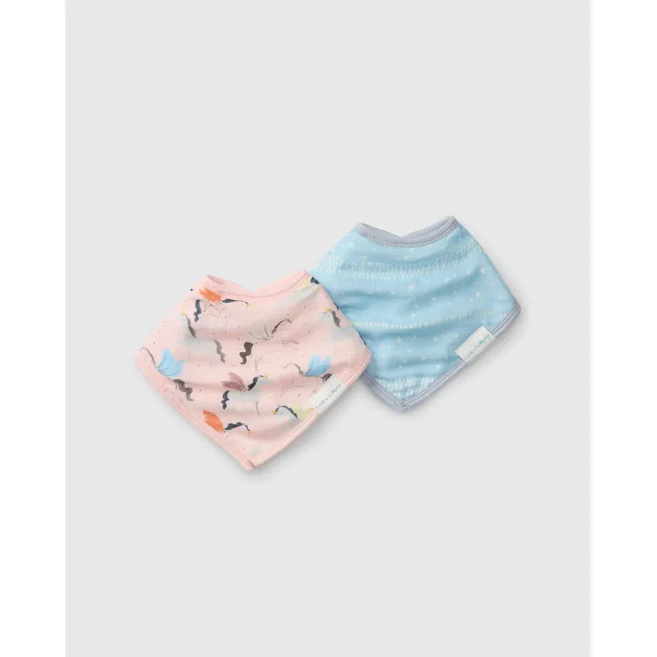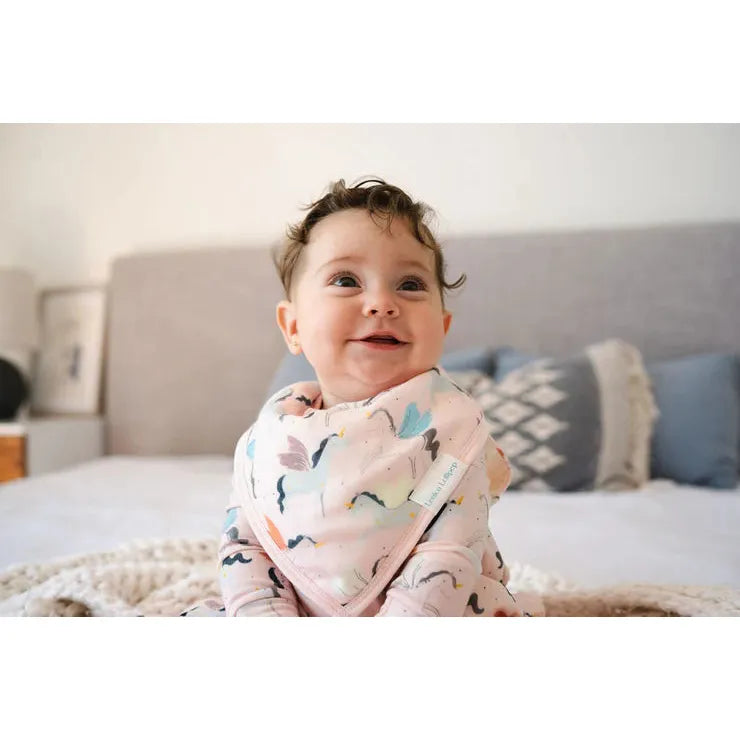 Our muslin bandana bibs have a super-absorbent and buttery-soft bamboo terrycloth backing to withstand dribbles, spit-ups, and spills and prevent irritations. The bibs feature a front neck panel that goes over the trim to eliminate neck irritation. Three adjustable nickel-free snaps to fit babies from three to 36 months. Available in a wide variety of fun prints and designs, these are the only drool bibs you will need. Manufactured at an OEKO-TEX Standard 100 certified factory, you can feel confident that our bandana bibs are free of toxic chemicals and safe for your baby.