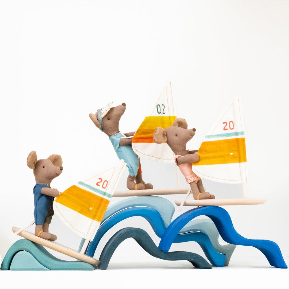 Little brother surfer mouse is wearing a wetsuit that is dusty blue and forest green. The surfer mice like to learn new tricks on their boards. After all, they don't mind if they fall off- it’s nice to cool off in the waves! His wooden board has two elastic straps to keep his feet in place and his magnetic hands help him hold onto and steer his sail.