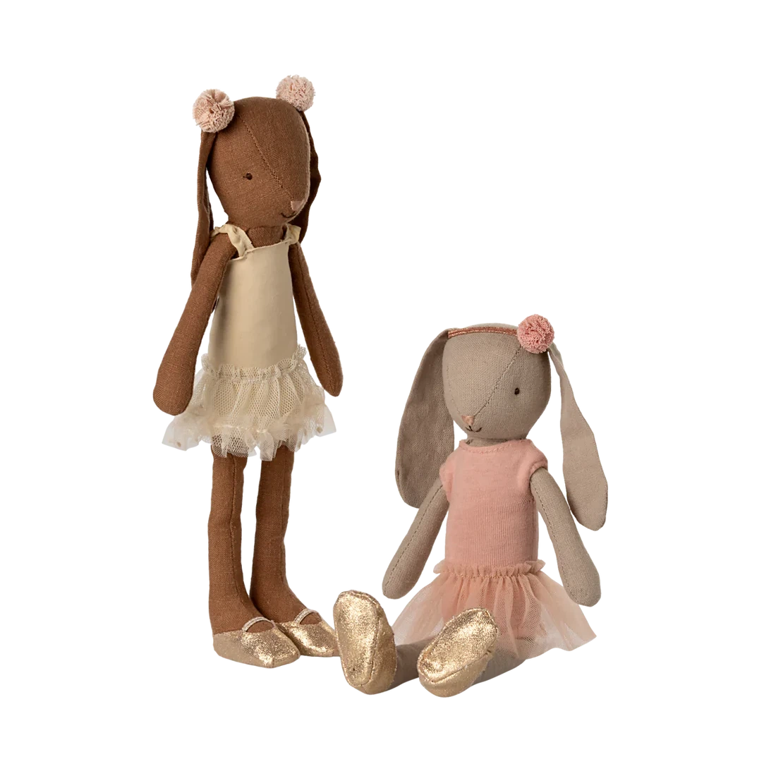 The well known Maileg bunny dressed up as a ballet dancer. It wears a cream colored suit, tulle skirt and ballet shoes.