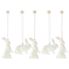 Easter bunny ornaments in metal with hand-painted flower details. They hang beautifully on a branch as decoration. Each box includes 5 ornaments.
