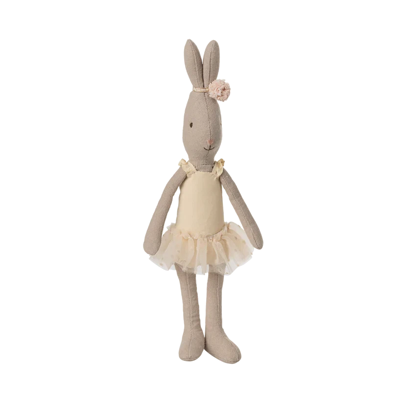 The well known Maileg rabbit dressed up as a ballet dancer. It wears a suit and tulle skirt and has a small decoration around the pointing ears.