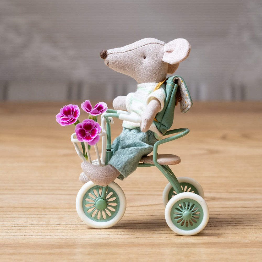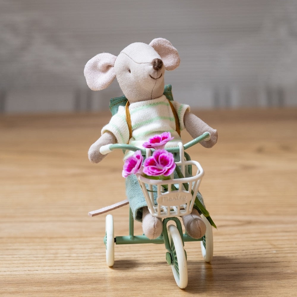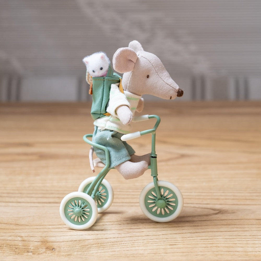 Big brother/sister mice fit this tricycle perfectly. Mice with magnets in their hands can easily hold the handles. This beautiful bike comes in a garage box to expand the play. Accessories as a basket and hanger can be purchased additionally.