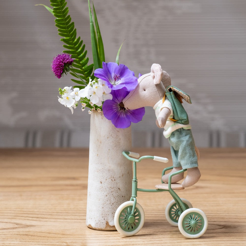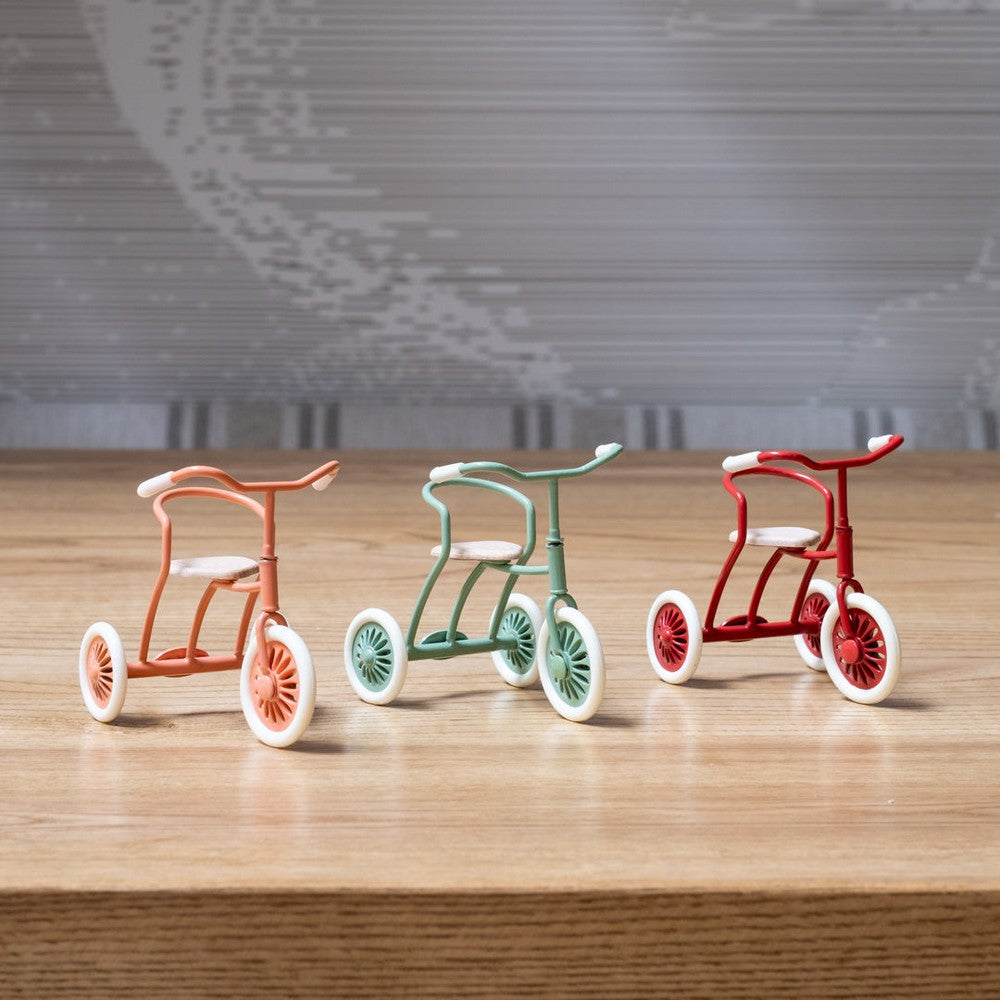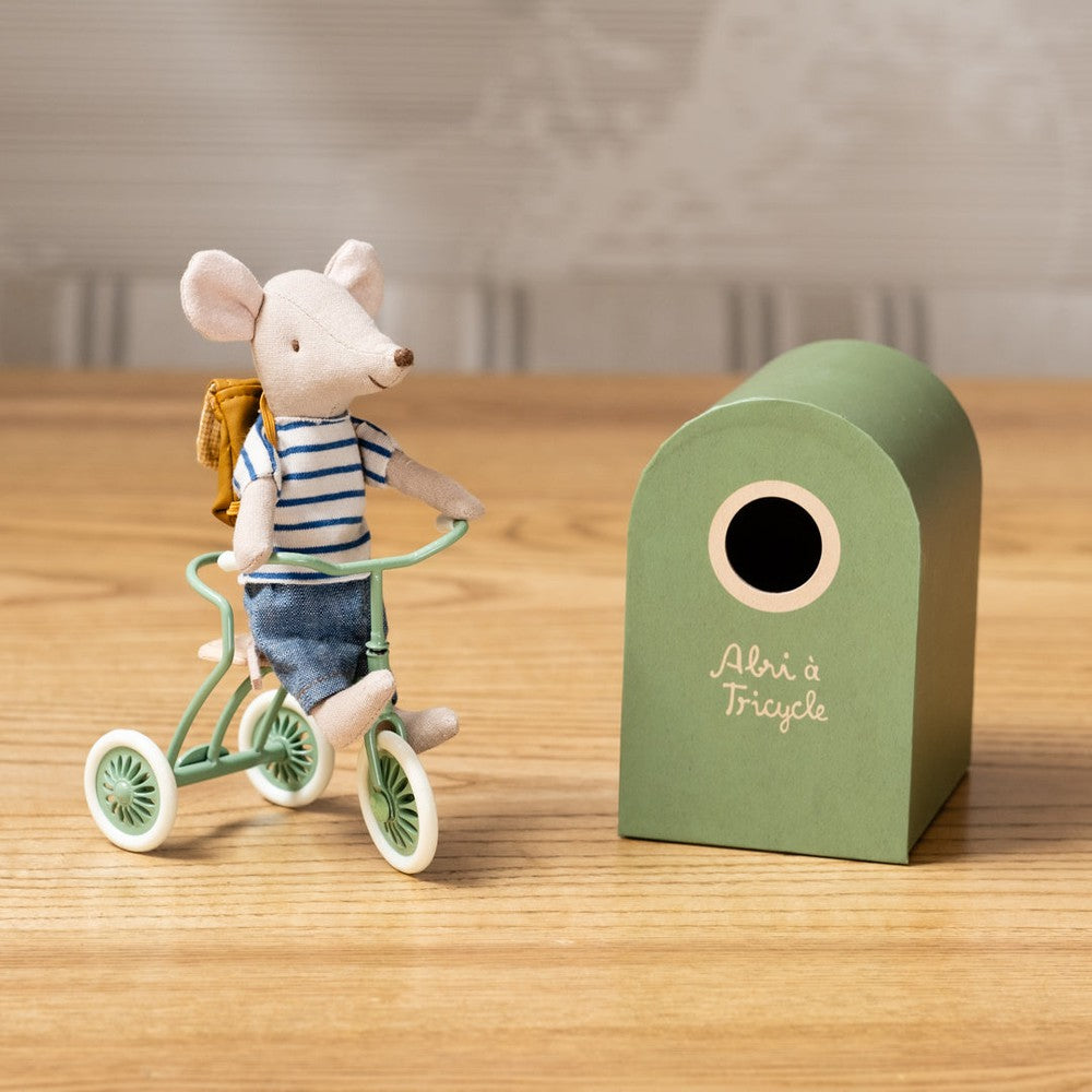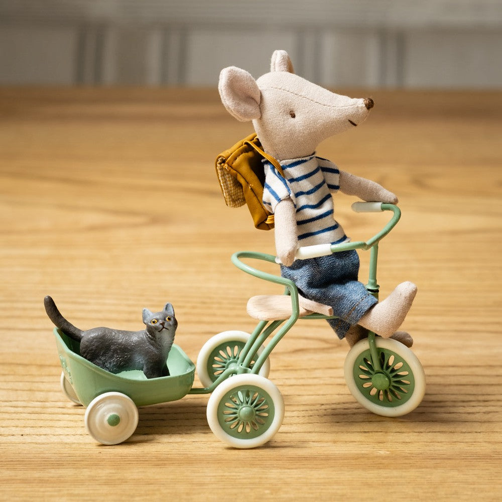 Big brother/sister mice fit this tricycle perfectly. Mice with magnets in their hands can easily hold the handles. This beautiful bike comes in a garage box to expand the play. Accessories as a basket and hanger can be purchased additionally.