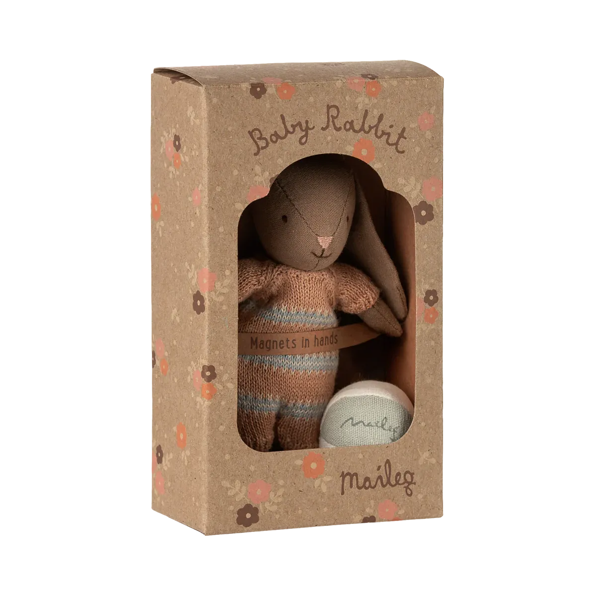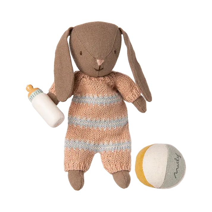 The perfect gift set to start hours of storytelling. It contains a small ball, a soft bunny in size micro with magnets in hands to hold the baby bottle. All fitted nicely together and a great start of any bunny collection.