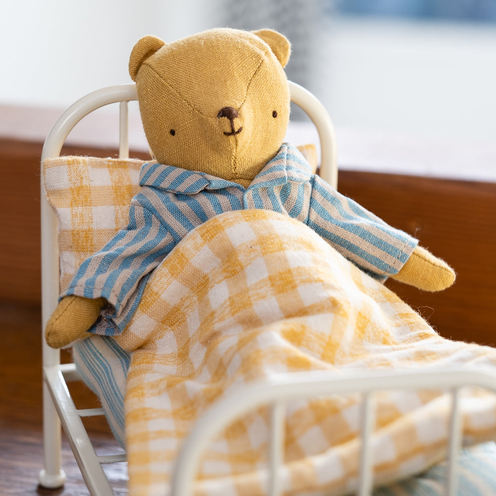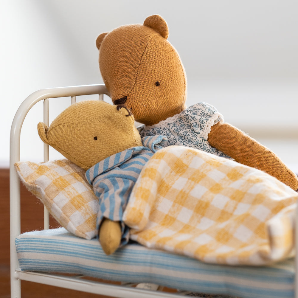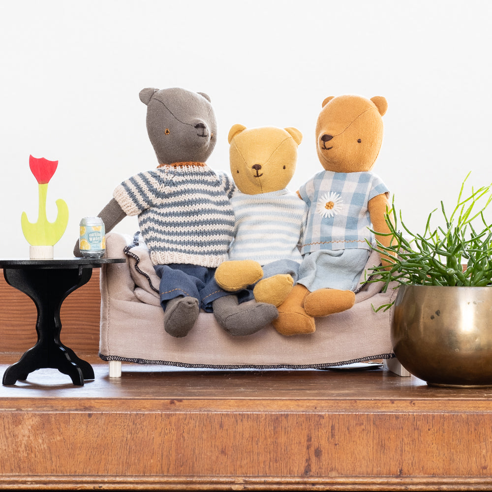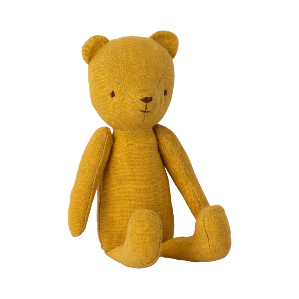 The Maileg Teddy bear family is a sweet collection of 3 different sizes of Teddy bears. They are made of soft linen and their shoulders are articulated so they can rotate and stay in place. The Teddy Family has a vintage look that will bring back dozens the memories. Teddy Juinor is a light Ocher colour.