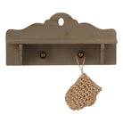 This little wooden shelf can be placed where ever you like in your Maileg Dollhouse. Little knobs are perfect for hanging little accessories. Here it's pictured with the washing mitt from the wellness set (sold separately).
