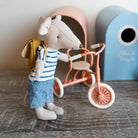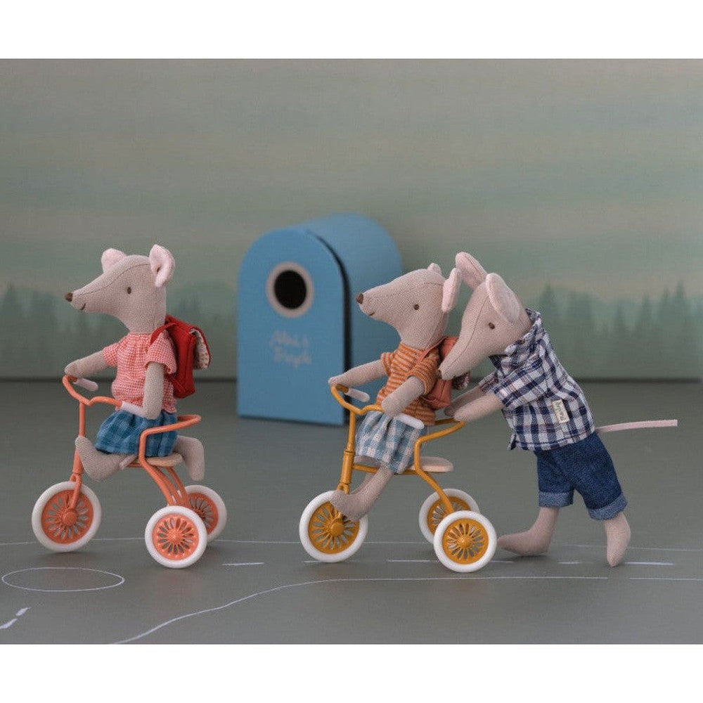 Big brother and big sister mouse are ready to roll around the neighbourhood with their new tricycles! This shiny number comes in coral with a wooden seat and rubber wheels. When you're done riding around, you can park your tricycle in the matching garage box. New big brother and big sister mice (sold separately) have magnets in their hands so that they can easily grip the handlebars. A tricycle basket can be bought separately and added to the handlebars.