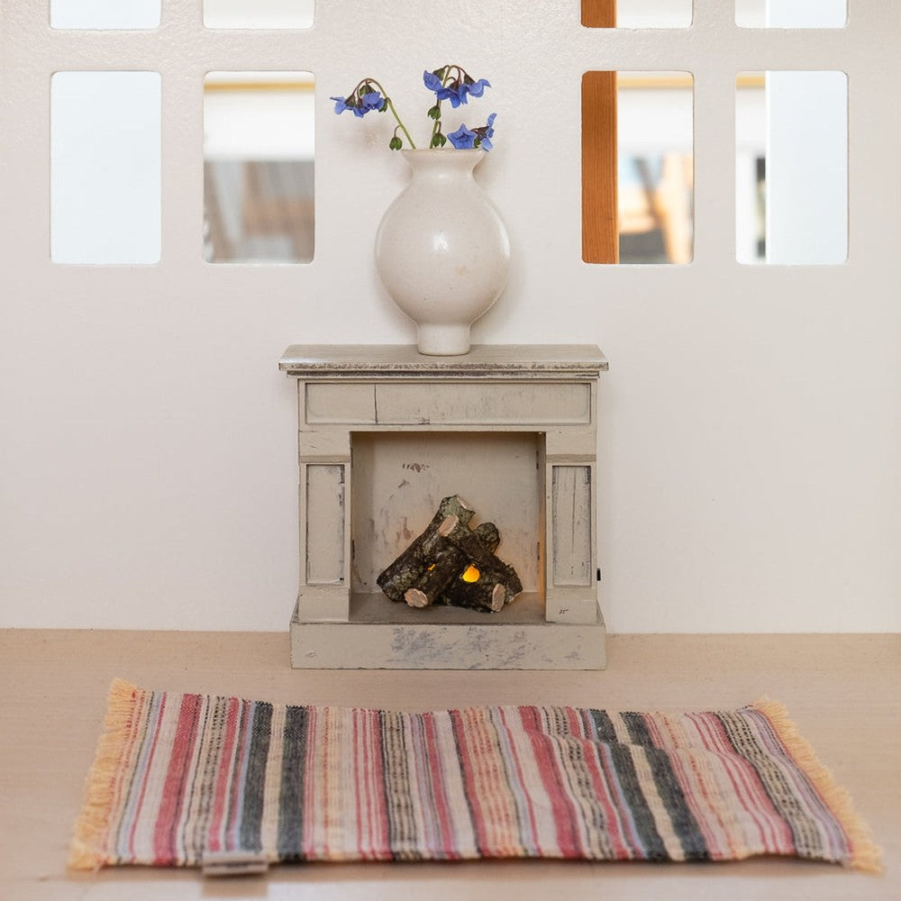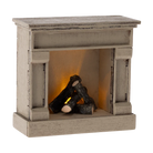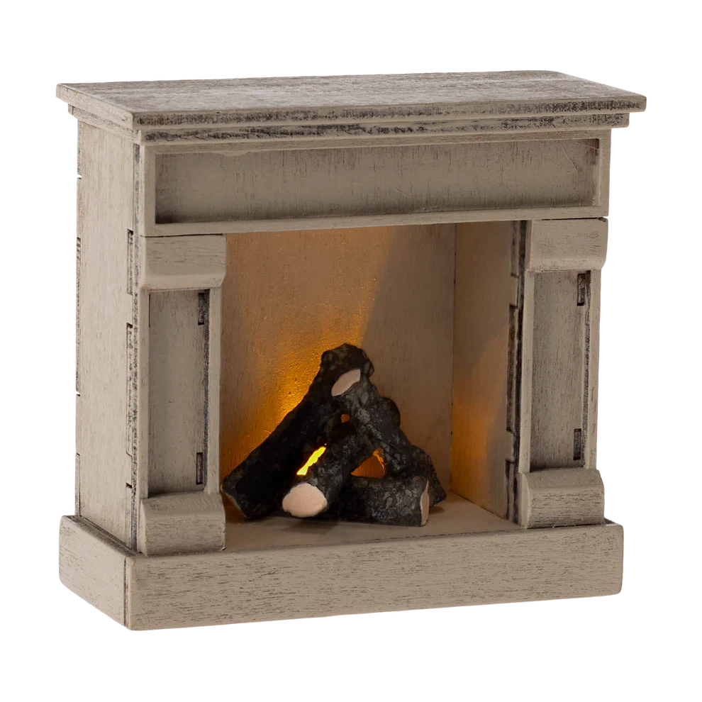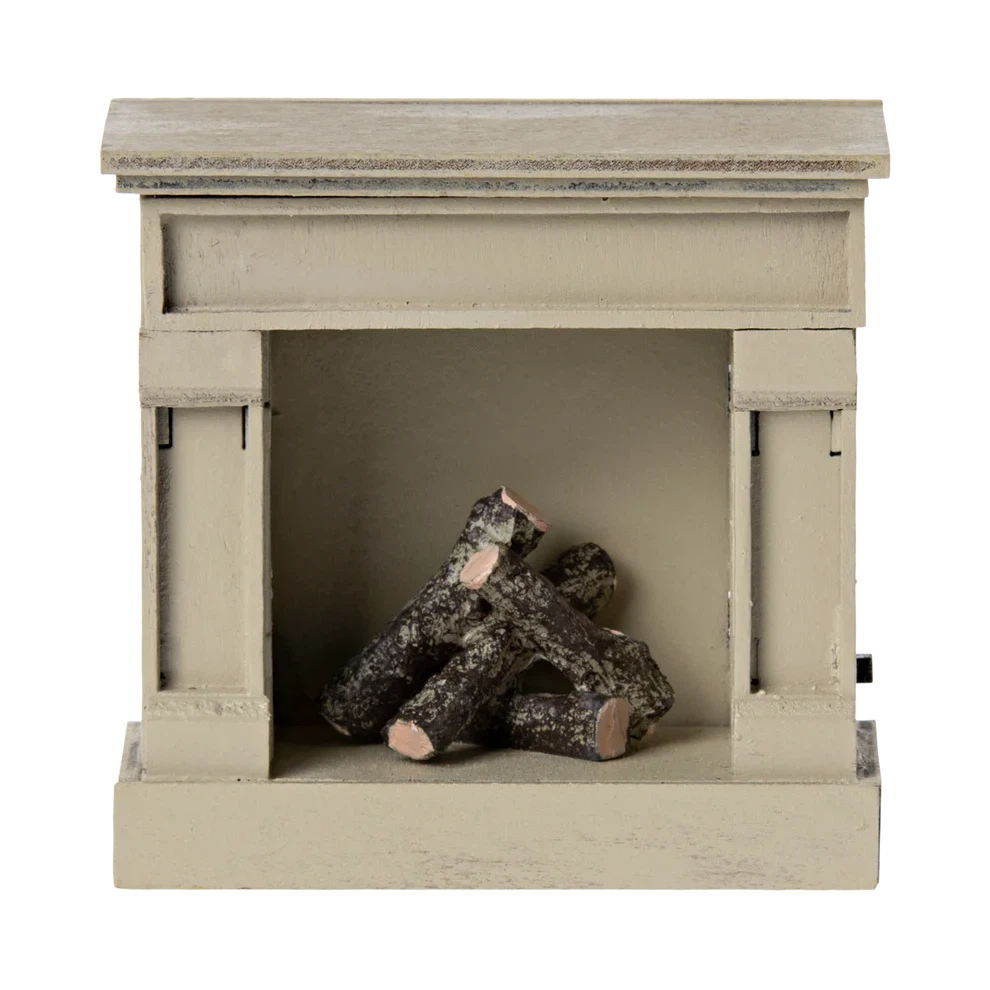 Use this wooden fireplace to warm your miniature Maileg home. It has an authentic look and a vintage finish. Remember to turn off the fireplace when your friends go to bed. The product comes without battery. You can add a coin cell battery (CR2032 3V). The box contains a hex key to use for opening.