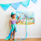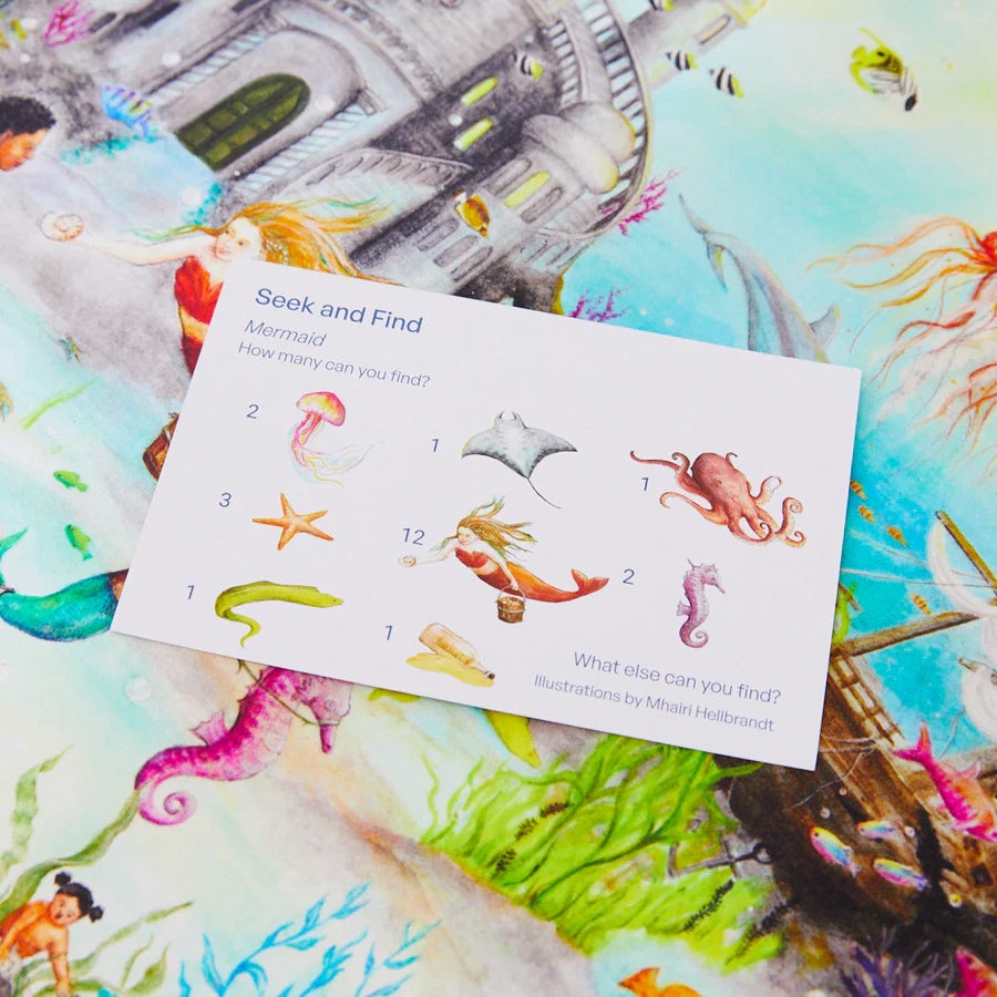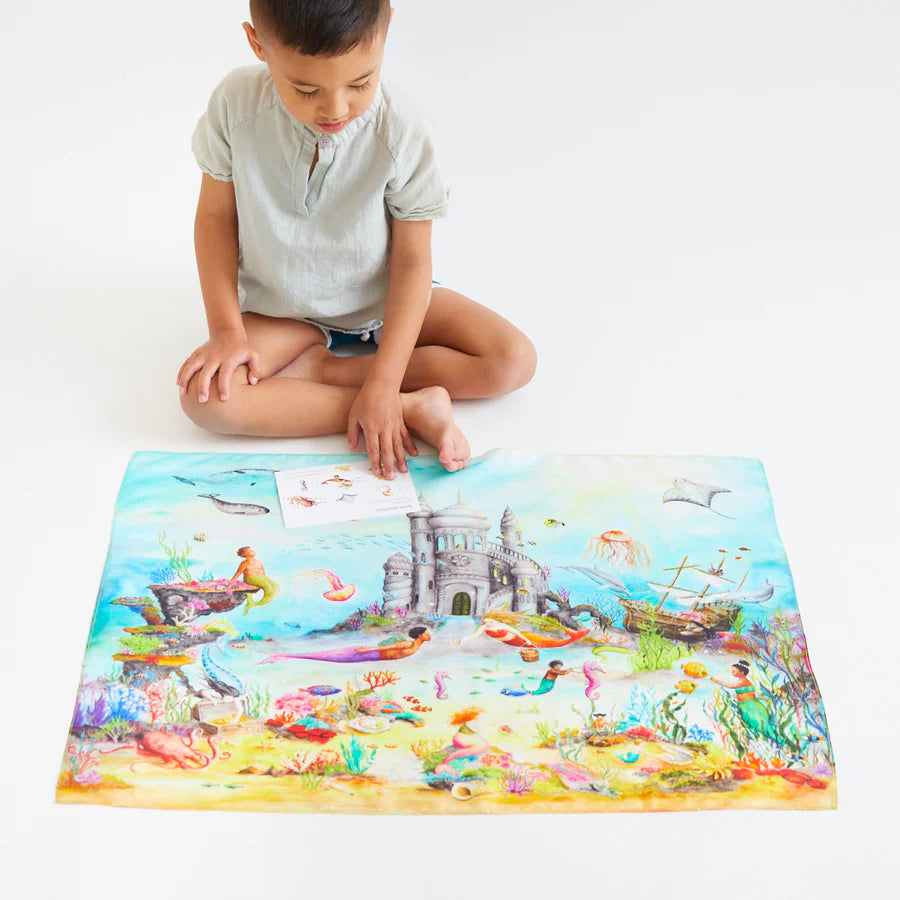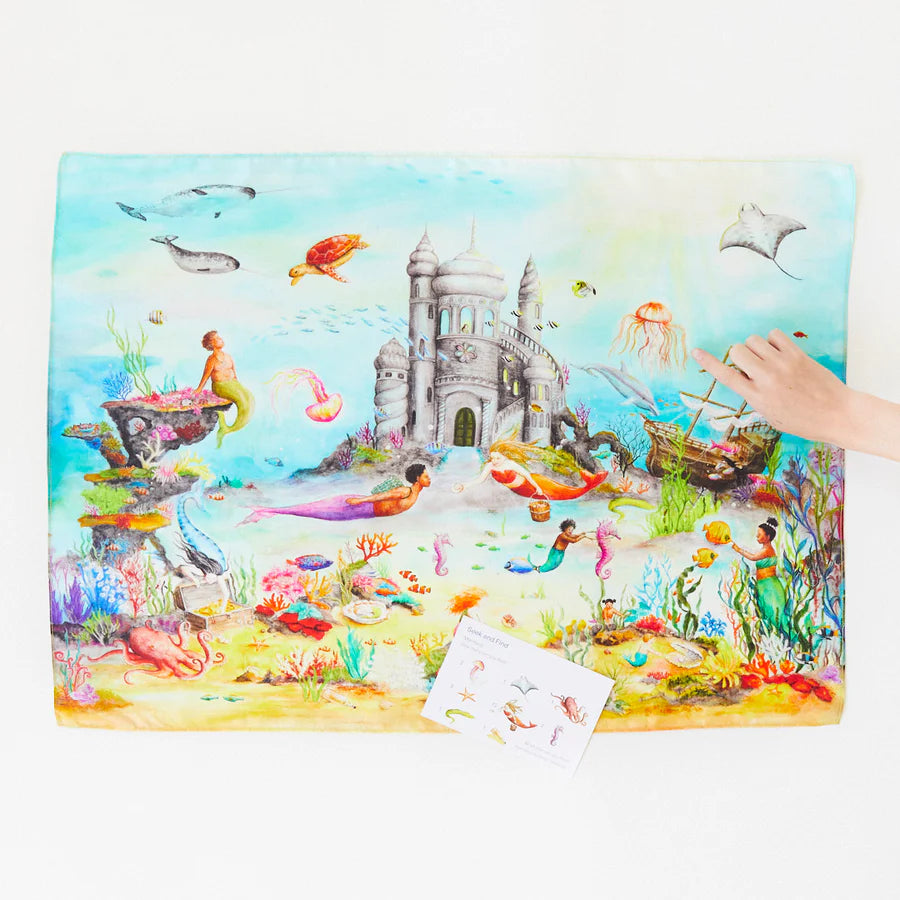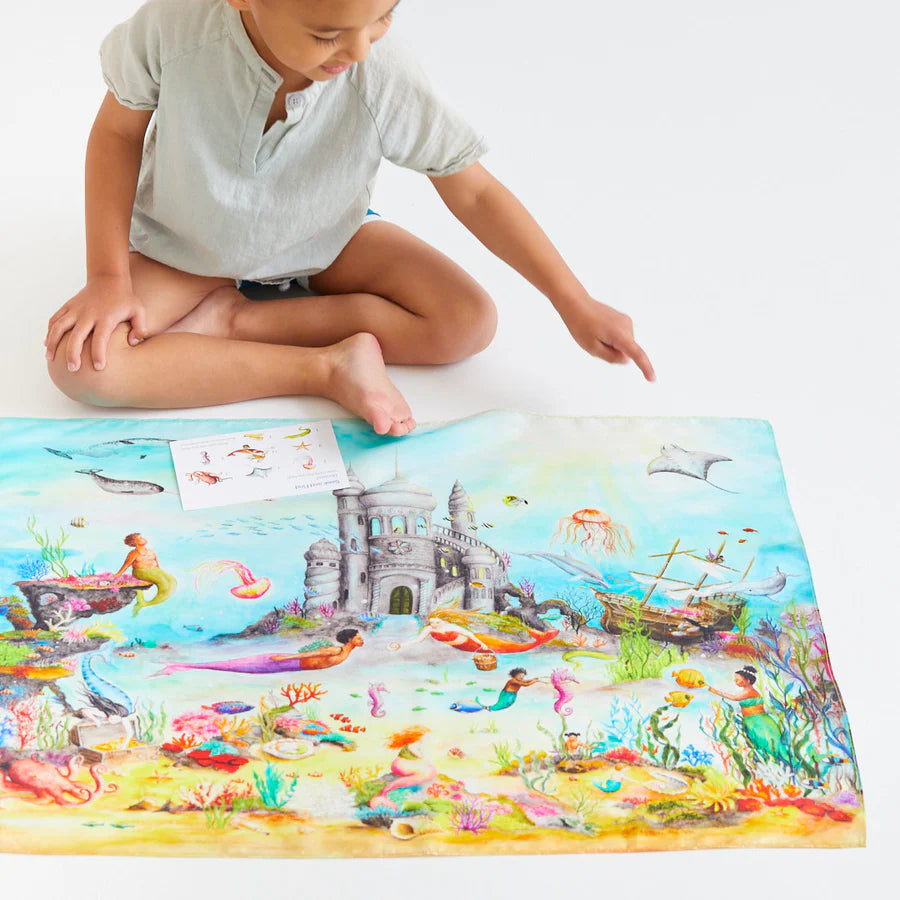 Seek & Find Playsilks are made in collaboration with different artists. The Mermaid Seek & Find Playsilk features original artwork by Mhairi Hellbrandt.