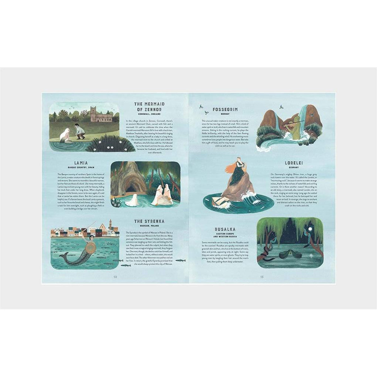 The colorful spreads will take you on an around-the-world journey, starting in Europe and the warm Mediterranean to the icy Baltic, as well as through countless isles, lakes and waterfalls, continuing to Africa with its immense lakes, cave pools and swampy deltas. Asia is the next stop with its thousands of islands, beaches, rivers and lakes while Oceania, surrounded by the Pacific Ocean with its scattered islands, seems to be the perfect environment for these mysterious creatures. The journey ends with North and South America, where there are sightings of water spirits and fish-tailed ocean goddesses throughout the whole continent, home to the freezing Arctic, the tropical Caribbean as well as the world's largest jungle.