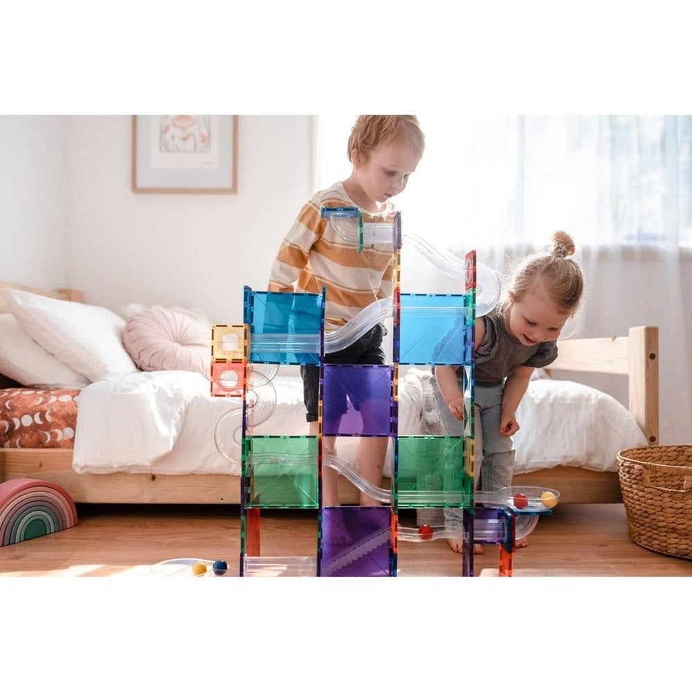 Take your magnetic tiles to grand new feats with the Connetix ball run pack. Included with this set are plenty of magnetic tiles to build your elaborate and inventive structures and unique clear fluted tubes for your marbles to zip through. With S-bends, split tubes, and special sound effect staircases, you can construct ball runs like never before. Connetix help develop hand-eye coordination and spatial awareness as well as boost creative thinking and are great for solo-play or with friends!