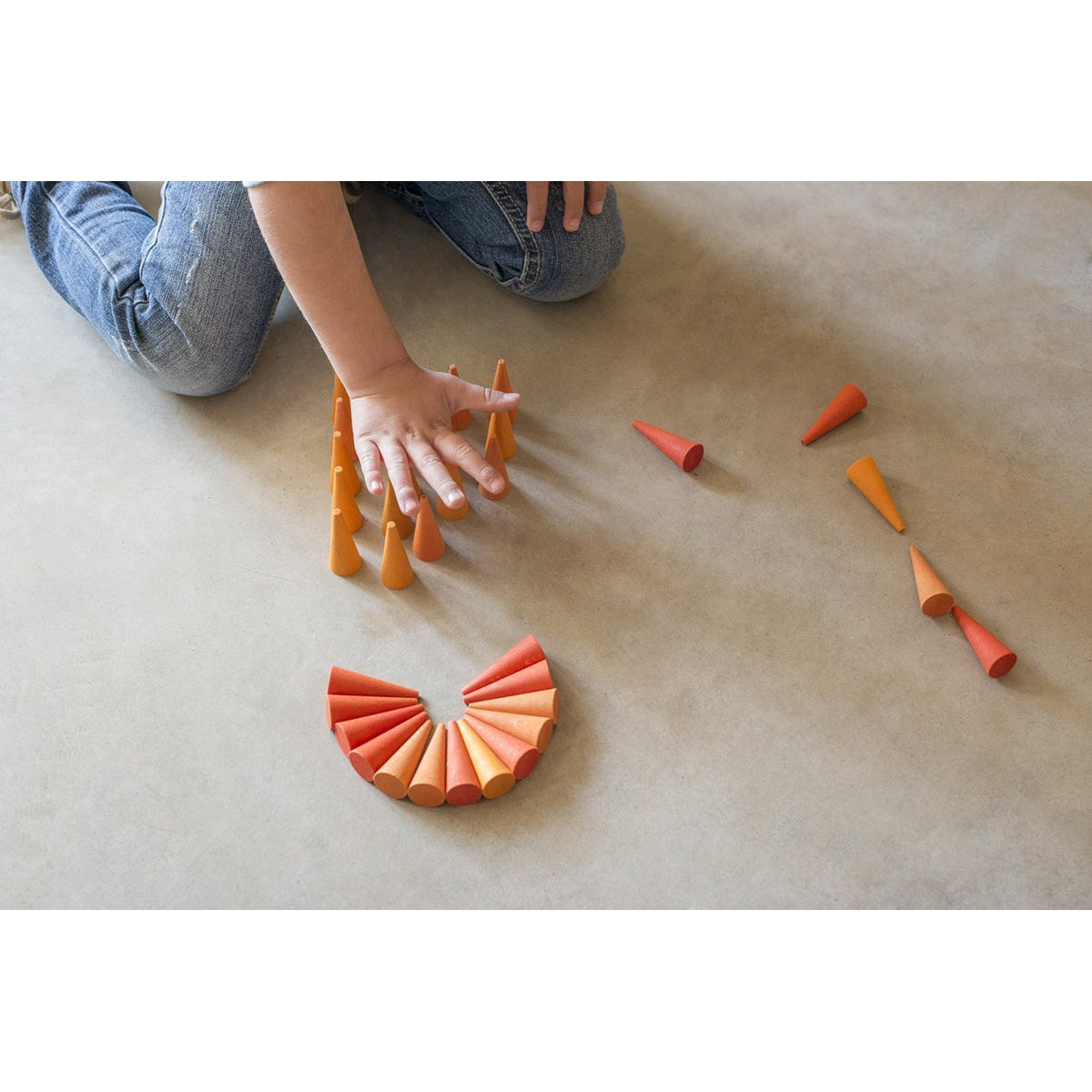 This set of gorgeous orange wooden mandala cones puts more tools in your tool box (or toys in your treasure chest as we like to say) to spark creativity and foster autonomous play. Design your own mandalas, shapes, and spirals with the mandala sets from Grapat. Sort and separate the different coloured pieces and create pictures with objects from nature walks or other mandala sets. Each mandala piece is great for imaginative play too, or for counting, building, and creating.