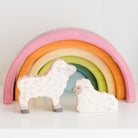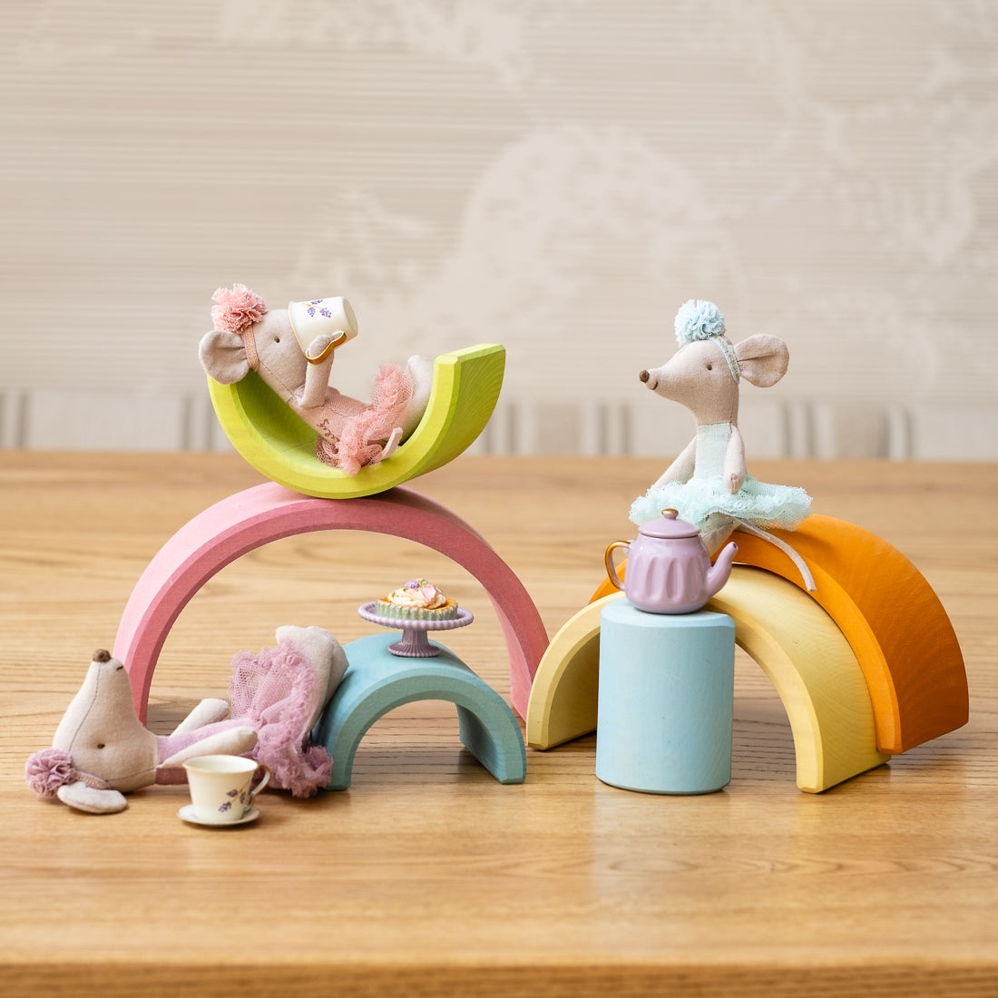 A springy pastel spin on our best-selling wooden rainbow stacker. Extend pieces to create a tunnel for your cars and trucks, then build to great heights for mountains, cluster together for little fairy homes, or lengthen into roads and bridges. Turn pieces on their side to weave marble tracks and then neatly stack back in order to sit full spectrum on the shelf.