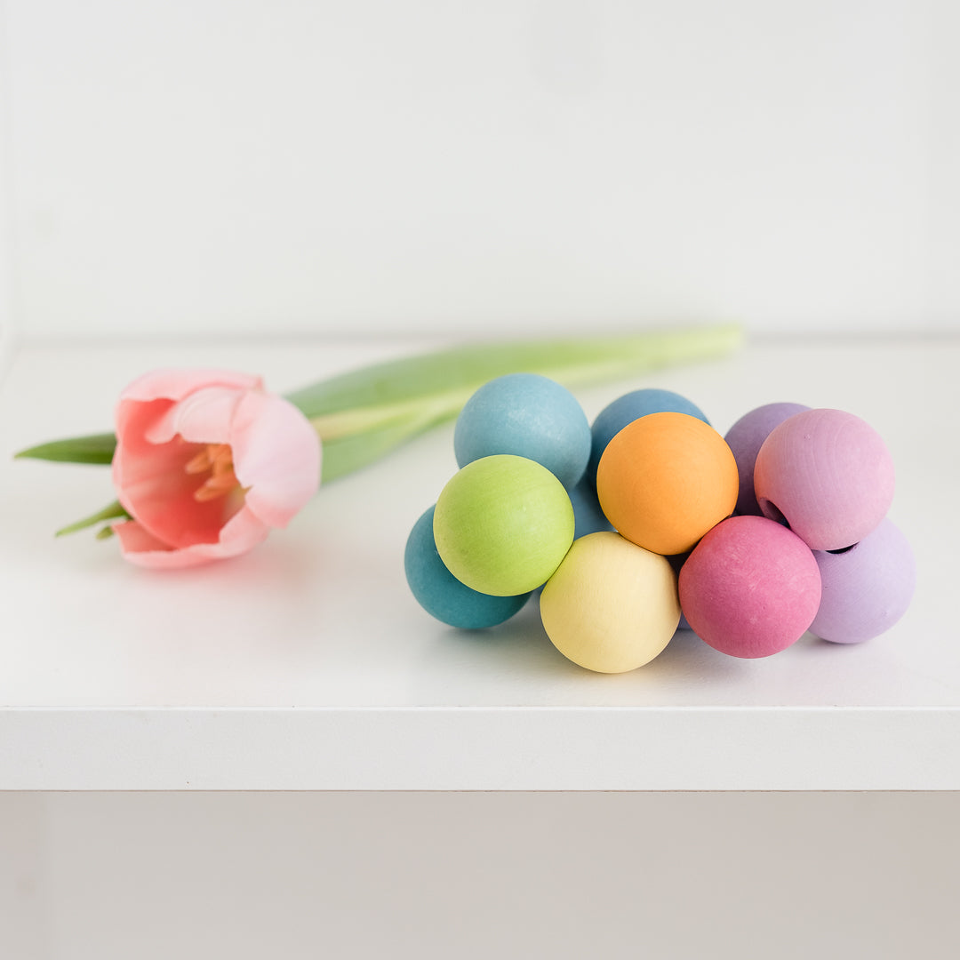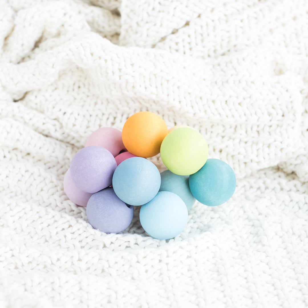 Our best selling beads grasping toy in a soft pastel palette. The rainbow bead grasper is so much more than it appears. Watch as your young baby squeals with delight at the colours, shape, and texture of this grasping toy that they can easily manipulate with their little hands. The soft, natural rainbow colours captivate babies from 3 months on and the wooden beads make a pleasant rattling sound when shaken. This toy is a favourite for baby showers and by far one of the greatest and safest toys for the wee ones that we have ever seen.