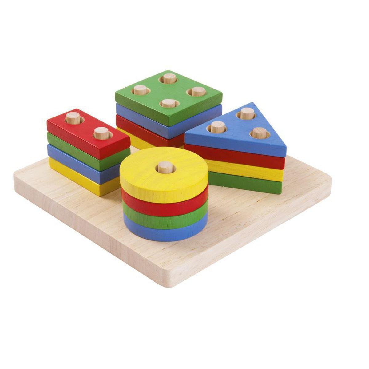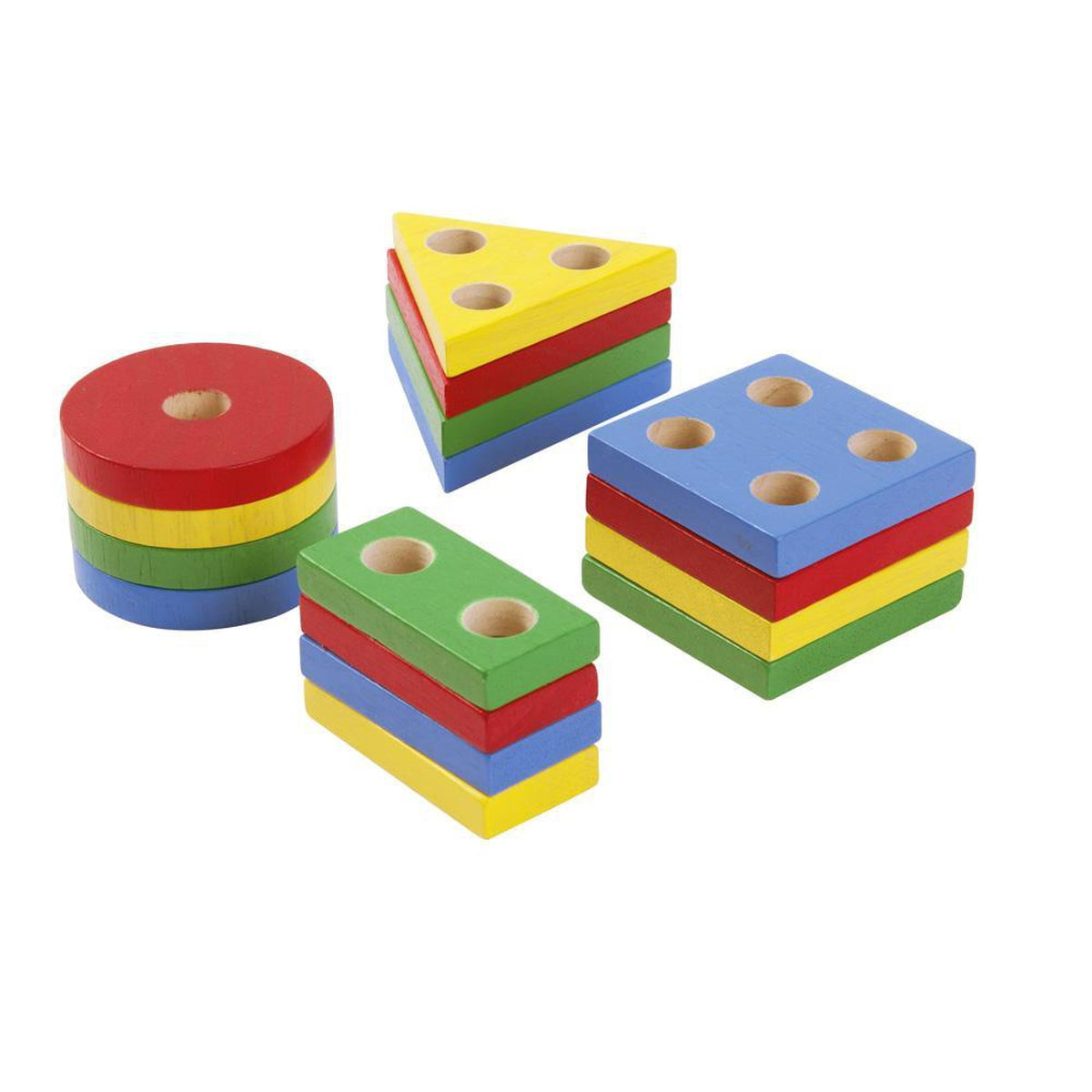 A set of 4 colorful geometric shapes can be stacked together according to the number of holes in the middle of each shape. A great Montessori toy!