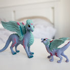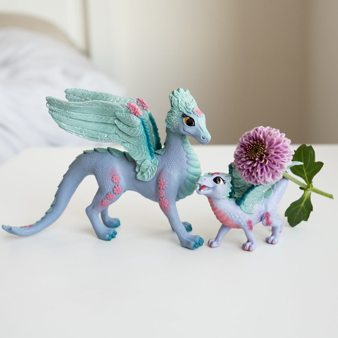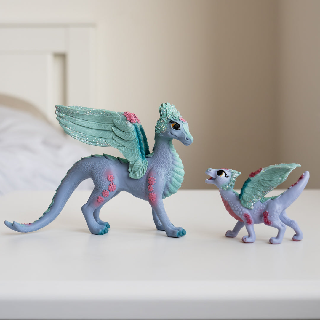 The beautiful flower dragon mum and her sweet baby by Schleich® bayala® live in the wide meadows of the dazzling bayala world. The baby dragon found the flower unicorn foal as a friend to play with and the two love to frolic over the flower fields. The dragon mum and the flower pegasus watch them with great affection.