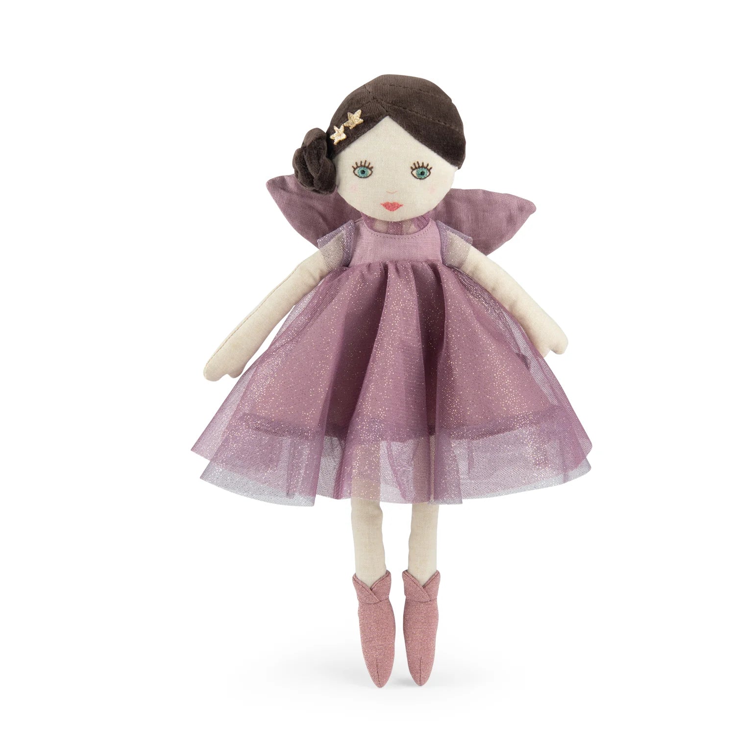 Step into a whimsical world with Fairy Isaline, the graceful guardian of dreams from the Les Fées collection. She wears a lovely purple gown adorned with gold glitter tulle and delicate fairy wings. Her soft velvet bun, sprinkled with tiny stars, and sparkling shoes complete her enchanting look. With a hand-embroidered, screen-printed face, Isaline is made for magical adventures and cozy cuddles.